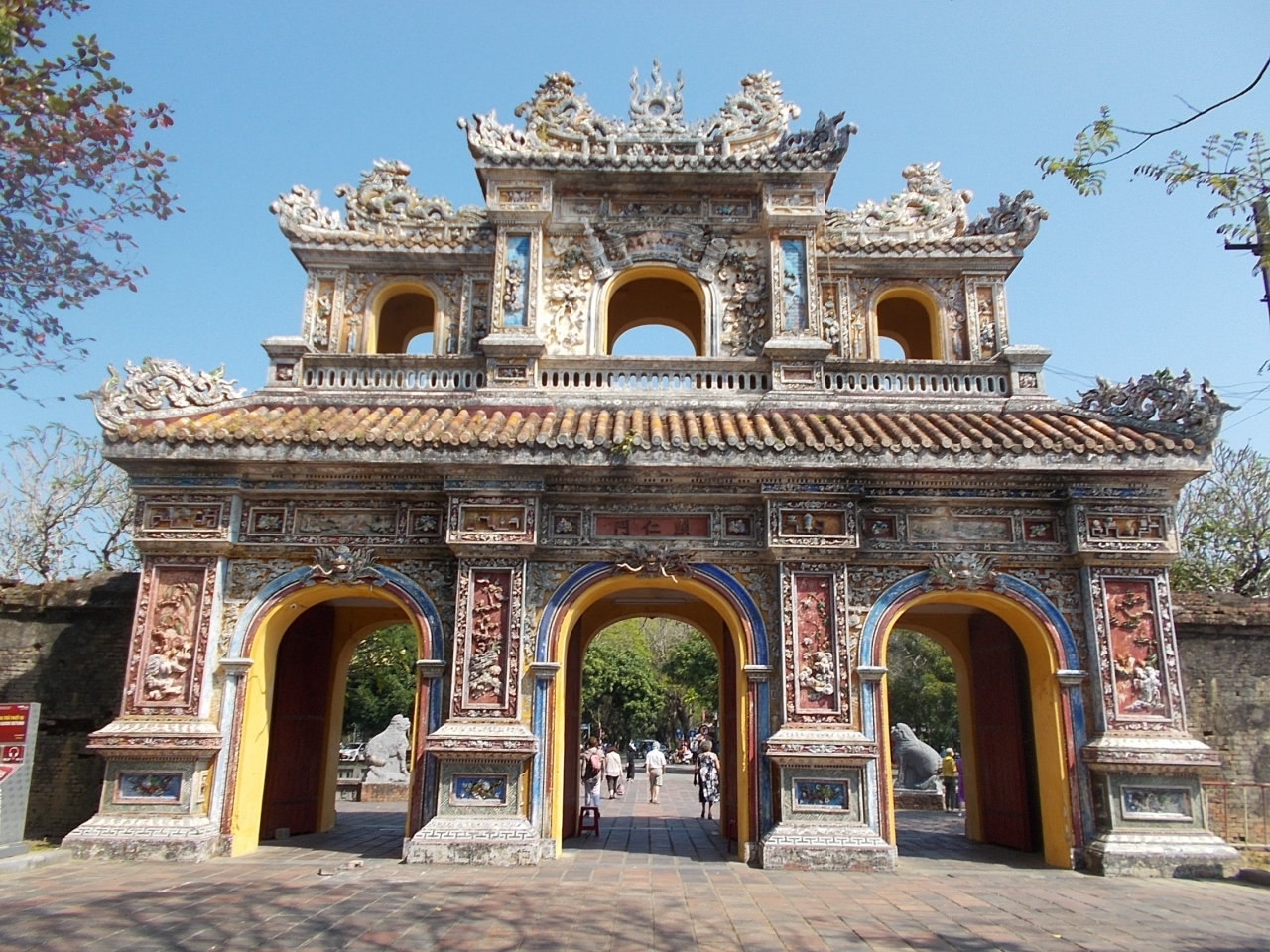 この顕仁門は王宮の門の一つです。壁で覆われた王宮の東側の門です。現在は王宮の見学の出口として使われています。装飾がされた見るための門です。全体を陶器で装飾でつくられています。色彩が施されていて門全体が芸術品のような印象です。素晴らしいです。