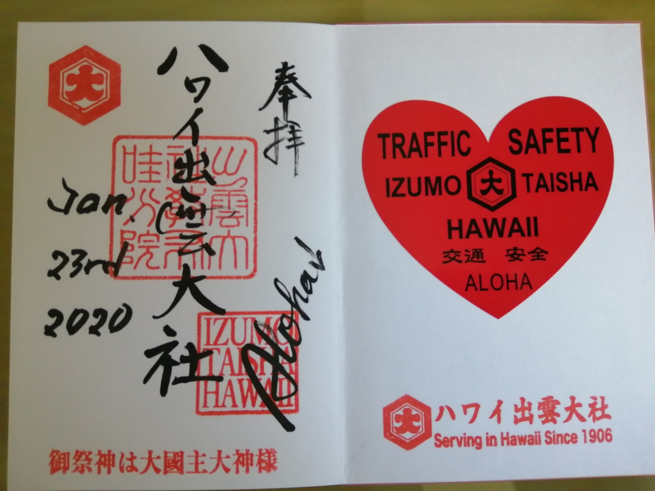 当日(平日午前中)はお参りしている人が少なく、お参りする人はやはり日本人ばかりでしたね。また神社の横には社務所があり、色々なお守りなどが販売しております。我々はハワイ出雲大社のお参り記念に御朱印を購入、後で良く確認してみると交通安全にご利益がある様です。なお御朱印を集めている方は、御朱印帳をご持参しても良いみたいです。カレンダーもあり、記念に頂きました。ご興味がある方はハワイでもお参りをしてみては如何でしょうか?