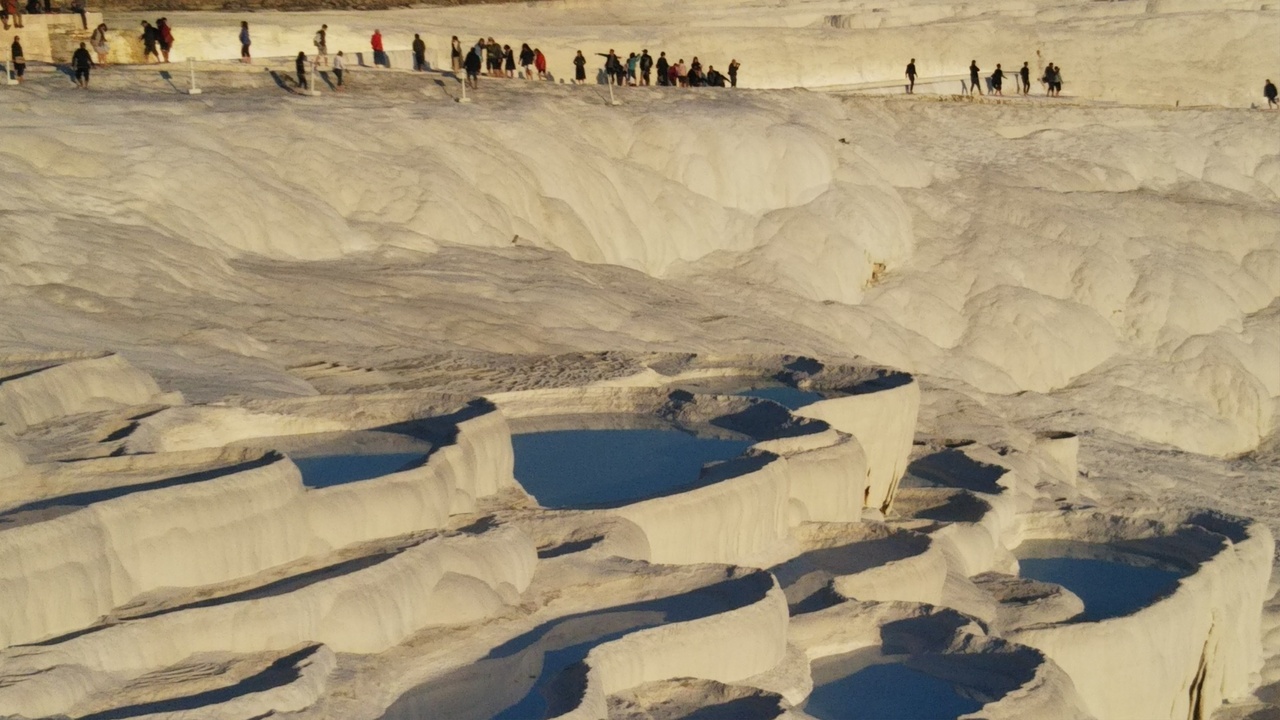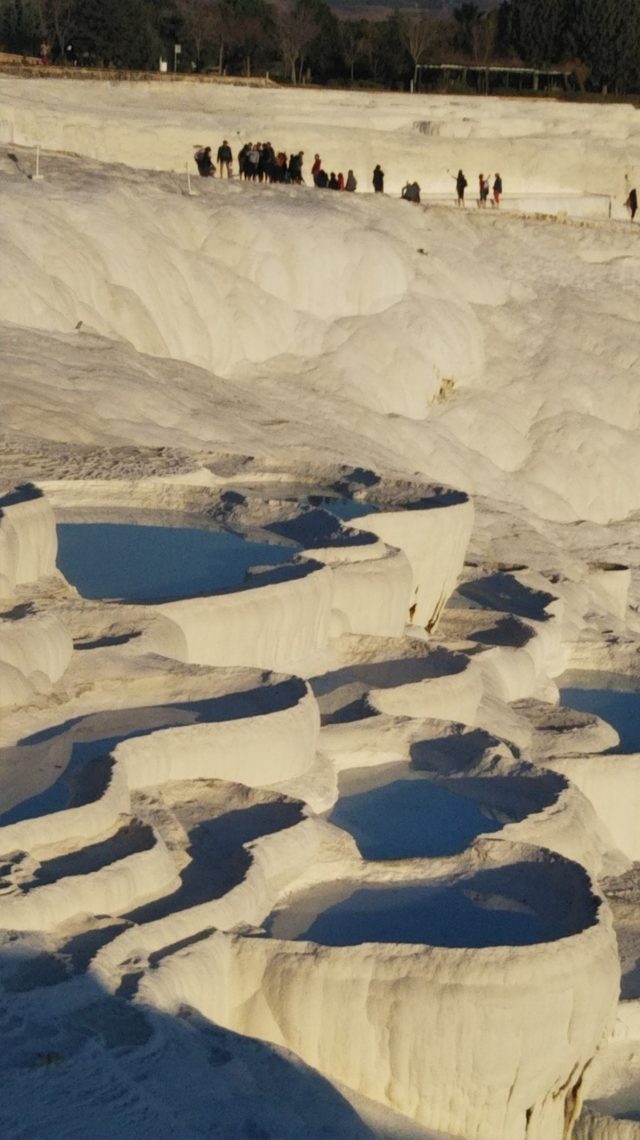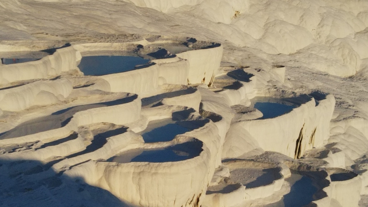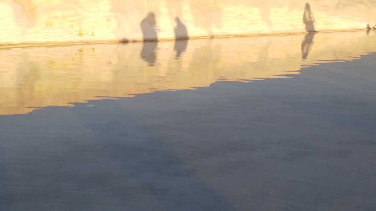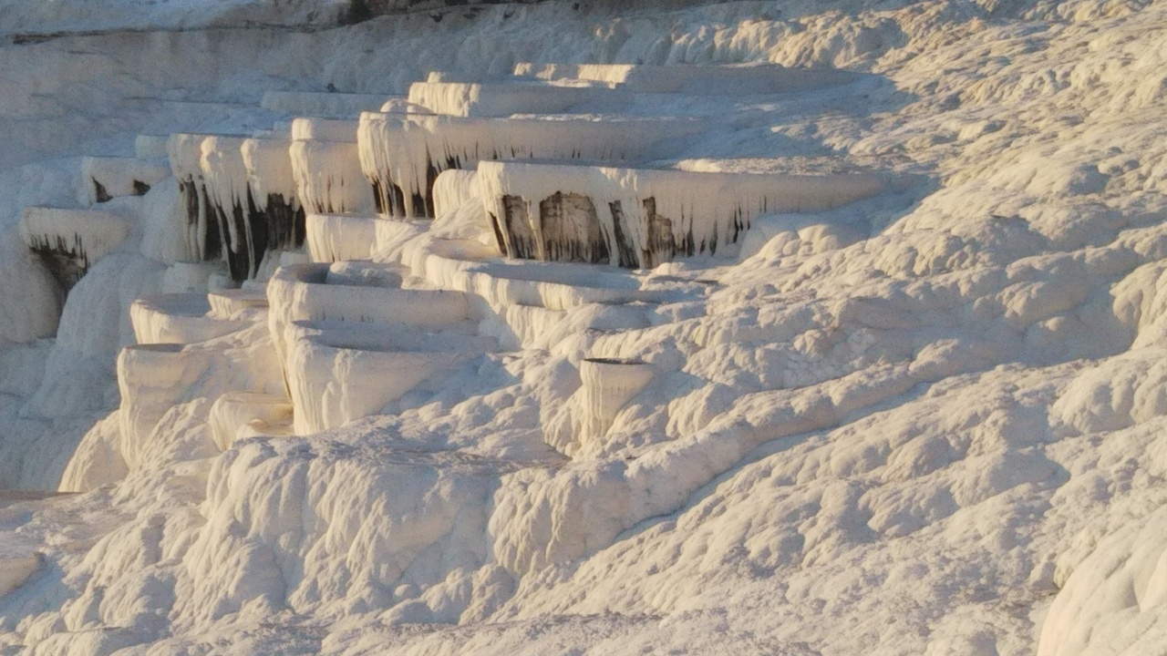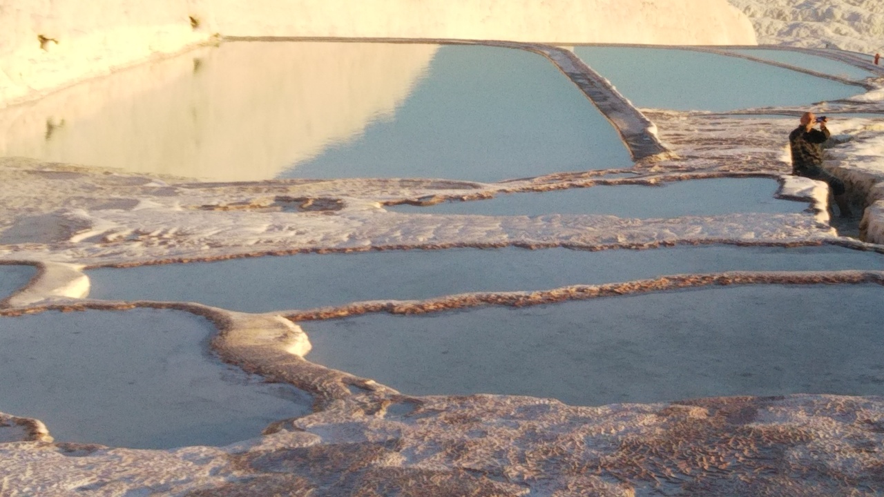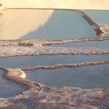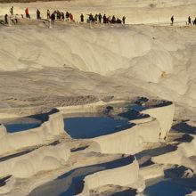 ヒエラポリス遺跡の中を歩いて行くと見えてきました。沸き出した温泉の成分が石灰化して、不思議な光景を生み出しています。真っ白ですが、雪ではありません。入りたい気持ちを押さえて、右奥にある石灰棚全景が見えるビューポイントで写真を撮ってから、靴を脱ぎ、入りました。水は暖かい所と冷たい所があり、滑り易い場所もあるので、気を付けながら一番奥まで裸足で行きました。帰る頃には陽が沈みかけ、最初に入っていたら、夕陽が当たっている石灰棚の写真は撮れなかったと思います。