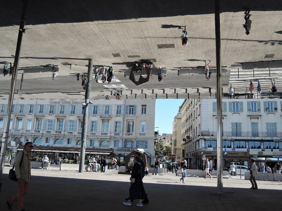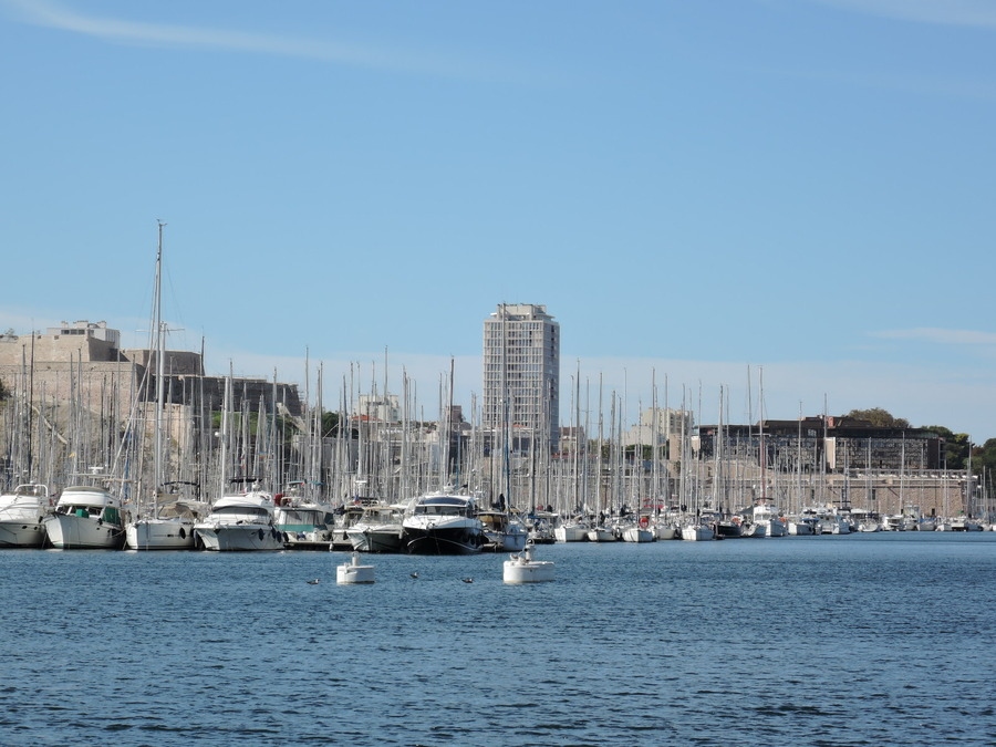 港の手前にはマルセイユ再開発「ICI」文字の青いモニュメントがありました。