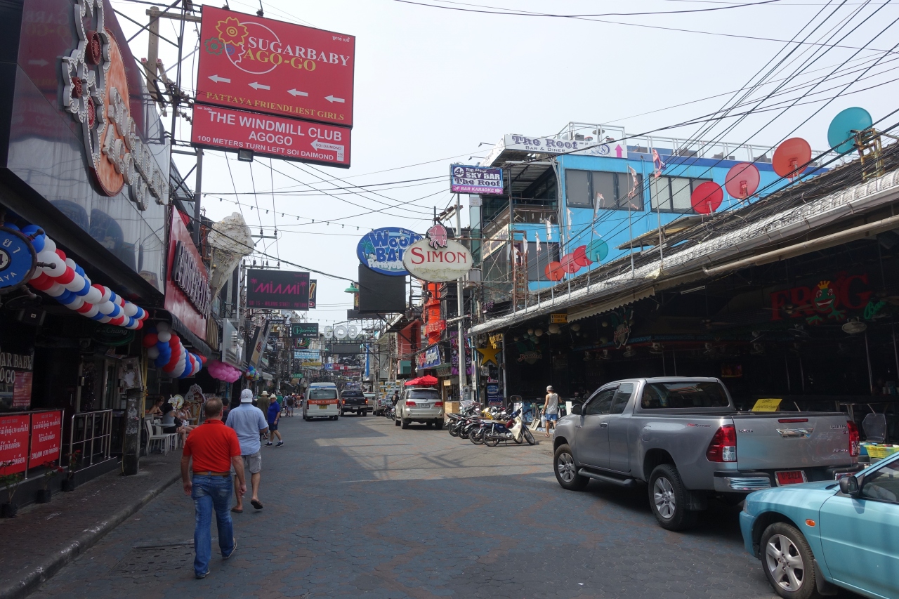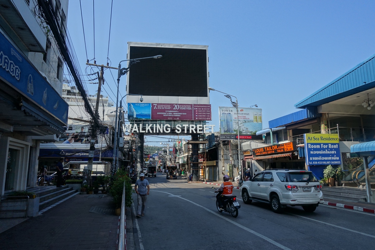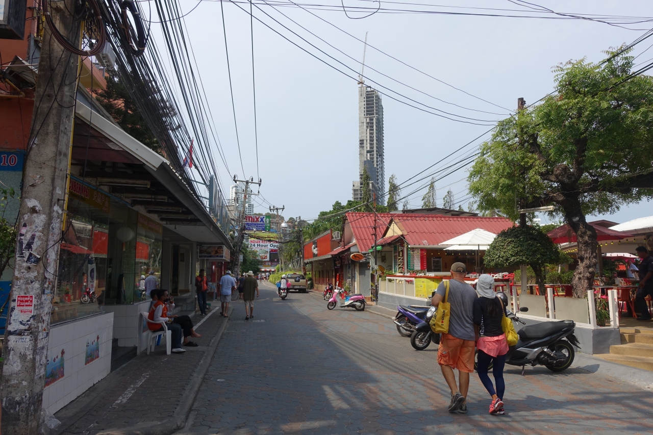 昼と夜で全然様子が違い、ここが本領発揮するのは当然夜でしょう。日中はラン島へ行くのにバリハイ桟橋に向かう観光客が通るくらいで、通り全体は夜に向けて「準備中」といった感じでした。特に午前は閑散としており、コンビニと一部飲食店などが営業しているくらい。夕方に通った時は多少人出はありましたが、それでも人をかき分けなくても歩ける状態でした。