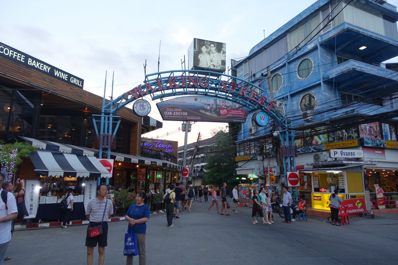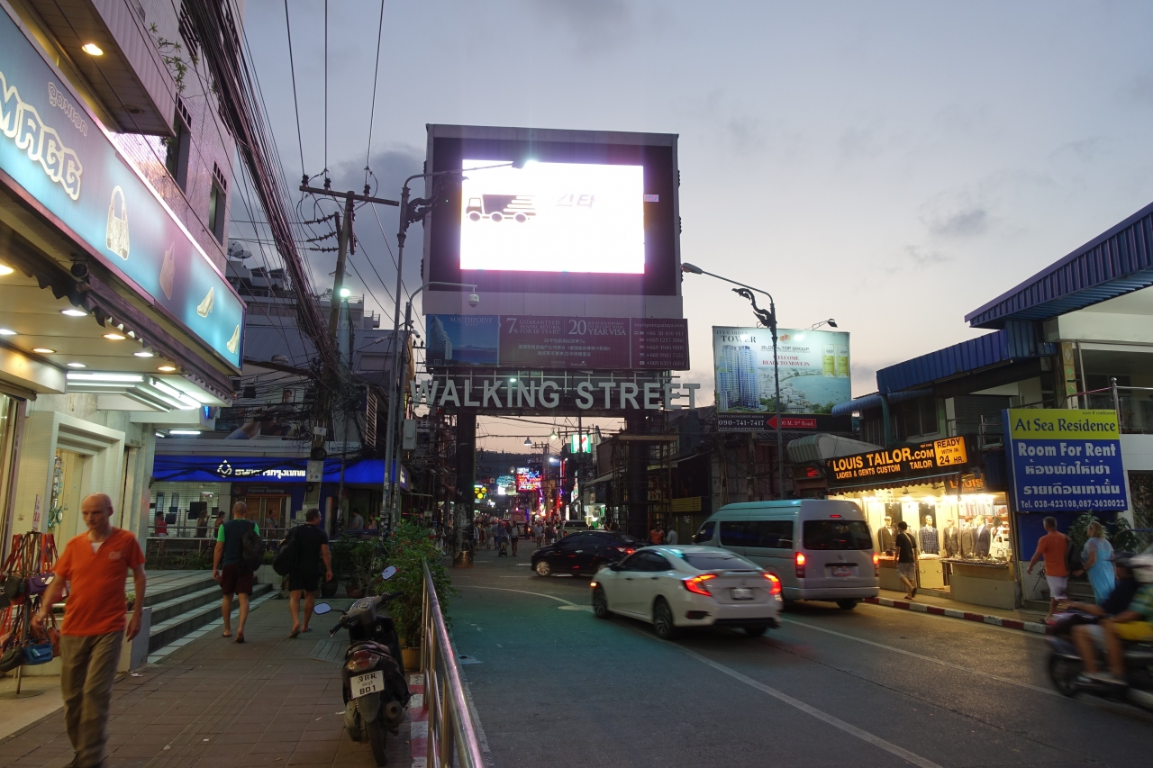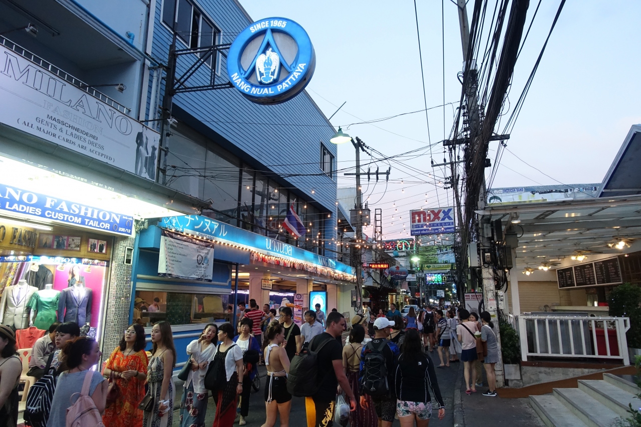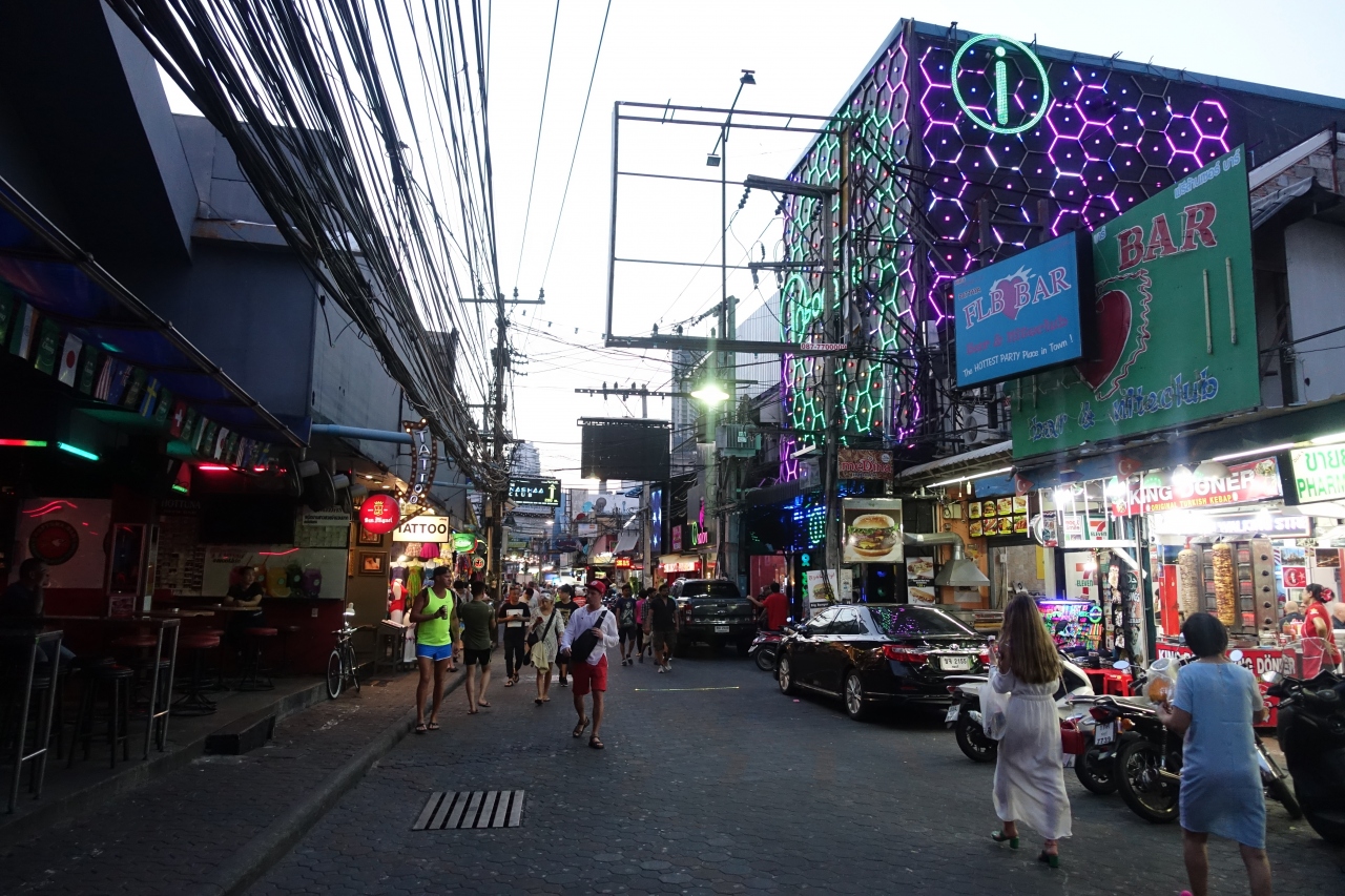 昼と夜で全然様子が違い、ここが本領発揮するのは当然夜でしょう。日中はラン島へ行くのにバリハイ桟橋に向かう観光客が通るくらいで、通り全体は夜に向けて「準備中」といった感じでした。特に午前は閑散としており、コンビニと一部飲食店などが営業しているくらい。夕方に通った時は多少人出はありましたが、それでも人をかき分けなくても歩ける状態でした。