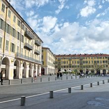 二ース近代現代美術館の前にある広場で周辺にはカフェやレストランがたくさんあります。浅い黄色の歴史的な建物が並んで美しい広場です。広場にイタリア統一の英雄ガリバルディの像があります。広場から旧市街に近く、道に入っていくと旧市街の細い路地になります。