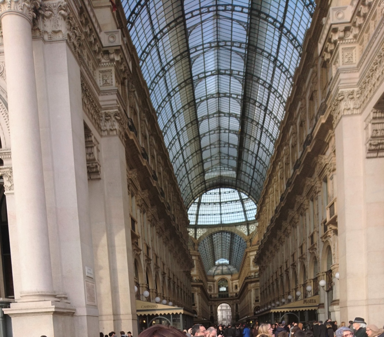 ミラノのドォーモ広場に隣接した天井が高い壮大なアーケード。高級ブティックや観光客目当ての飲食店が軒を連ねる。日中は観光客や買い物客でいつも大勢の人出がある。ここはいかにもミラノとい場所である。ちょっと値が張るが一度はこの中の飲食店でコーヒーを飲みたい。