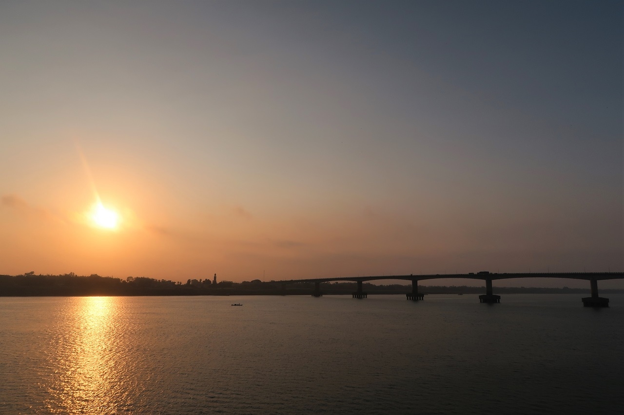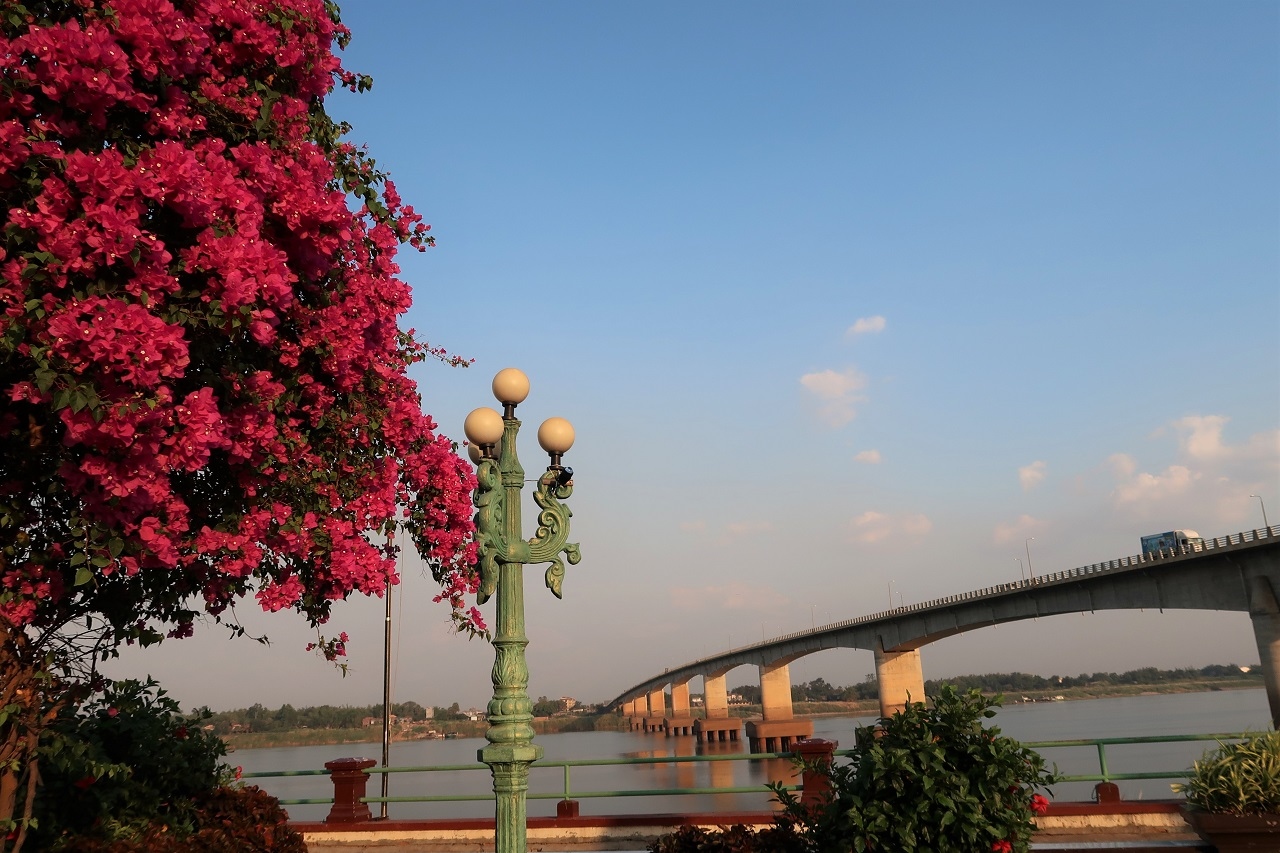 コンポンチャムの中心部、メコン川の西側に遊歩道が綺麗に整備されています。ブーゲンビリアなどの花が植えられた場所もあって、ちょっとした公園にもなっています。お勧めは晴れた日の朝の散歩。メコン川の対岸から太陽が昇ってきますので、サンライズとキズナ橋を1枚の写真におさめることができます。