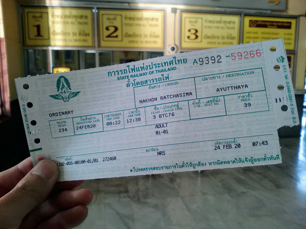 列車番号234…コラート発8:22ーアユタヤ着12:38に乗車。