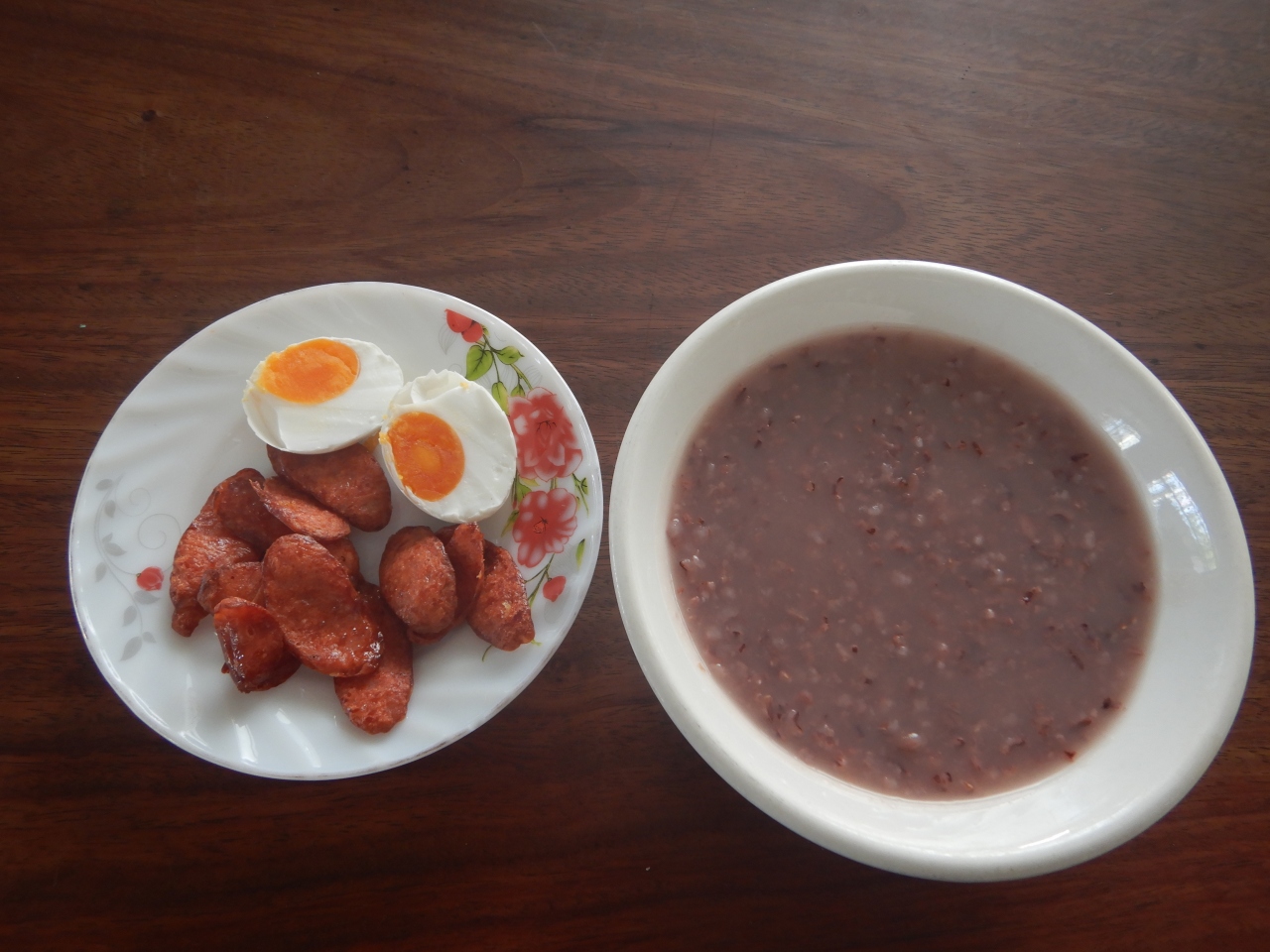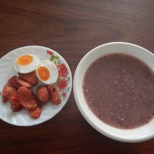 1年前もお粥を食べたが、今回のお粥は全く異なっていた。まず米だが、白米から色付きの米に変わっていた。付け合わせも何種類かあり、塩漬けの卵とチャイニーズソーセージを炒めたものを選んでみた。味はまずまず。ただ卵が殻付きだということに気が付かずに、お粥の中に入れてしまい、慌てて取り出して、殻をむいてからもう一度入れて食べた。