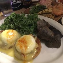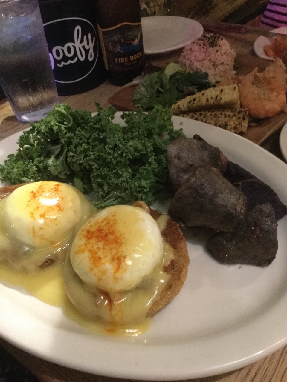 エッグベネディクト、フライドライス、ガーリックシュリンプを注文。