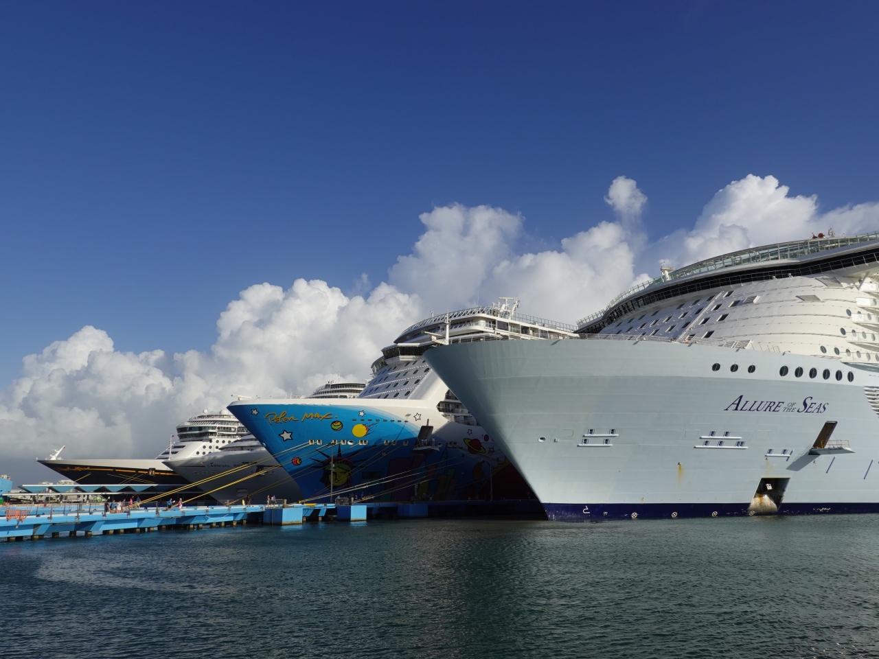 サンファン港はオールドサンファンの南側、カリブ海に面した場所です。私たちが訪れた日は大型クルーズ船が4艘ならんでおり圧巻の光景でした。夕方には汽笛が鳴り響き、出航を知らせる合図だと思いました。サンファン港近辺は大勢の人でにぎわっており、活気あふれる光景でした。