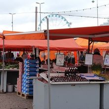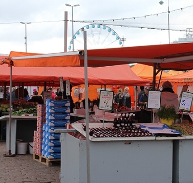 ヘルシンキの港、船着き場に面した広場です。朝の9時過ぎに行ったときはすでに野菜や土産物店が多数設置されていました。昼頃になると飲食店などにも人だかりができて大賑わい、魚介の揚げ物、スープなど美味しそうなものが並んでいました。