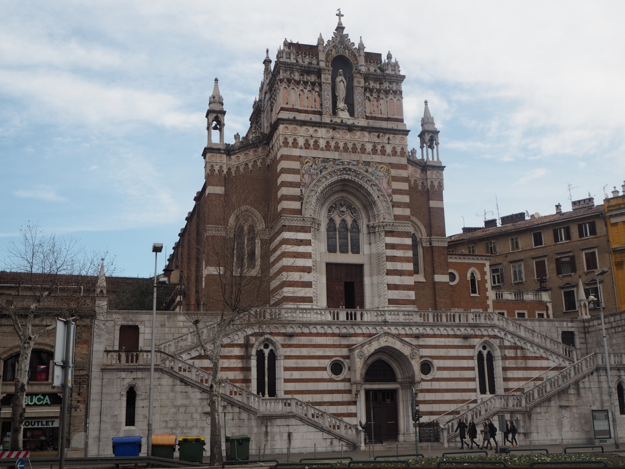 リエカの旧市街の西の端に教会はあります。バスターミナルもすぐ近くです。教会は道路に面してありますが、少し高台にあるので、よく目立つ建物です。ゴシック様式の建築で、ファサードなどがオレンジと白の縞模様になっており、目を引くアクセントになっています。建てられたのは20世紀初頭とまだ教会としてはあたらしいものです。