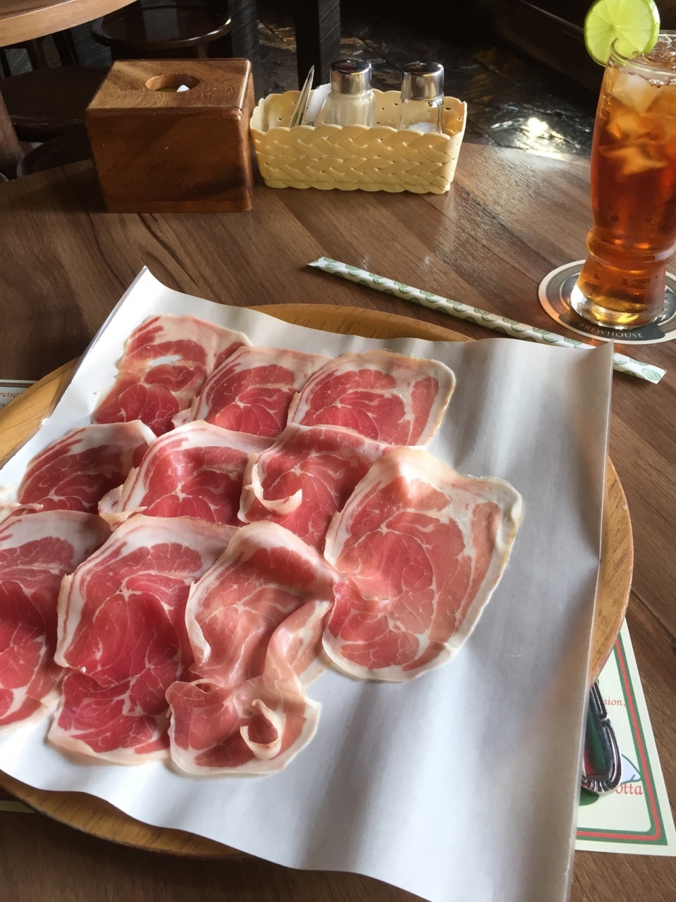 もはやパタヤで常連になっている店です。生ハムはいい感じに塩気もあり脂身もちょうどいい感じです。割とクーラーが効いているので、寒さに弱い人は窓側(ビーチロード側)のカウンター席に座れば西陽が入ってあったかいし、ビーチロードや海を眺めながら食事ができる。