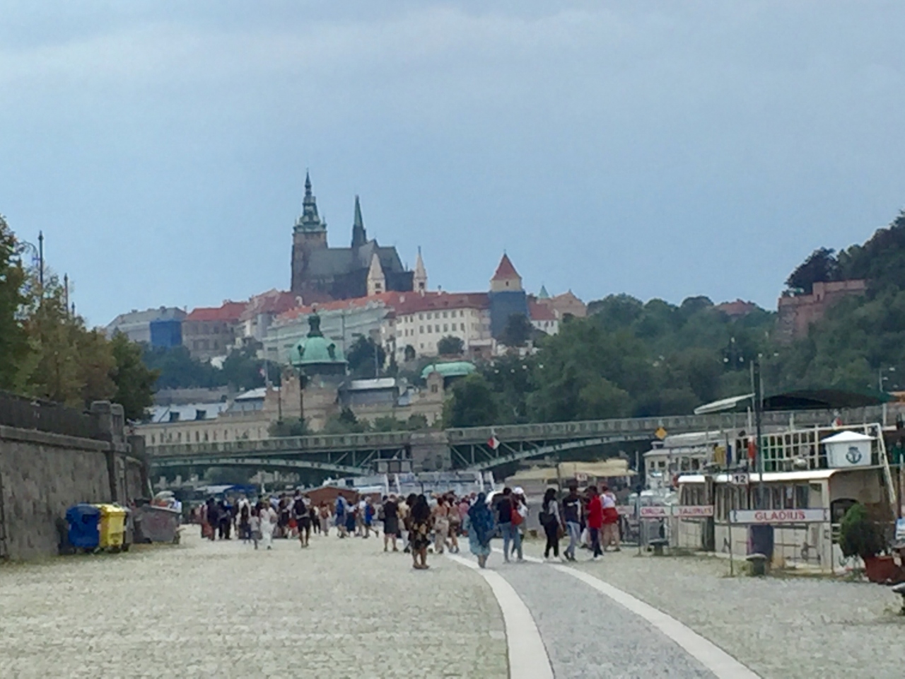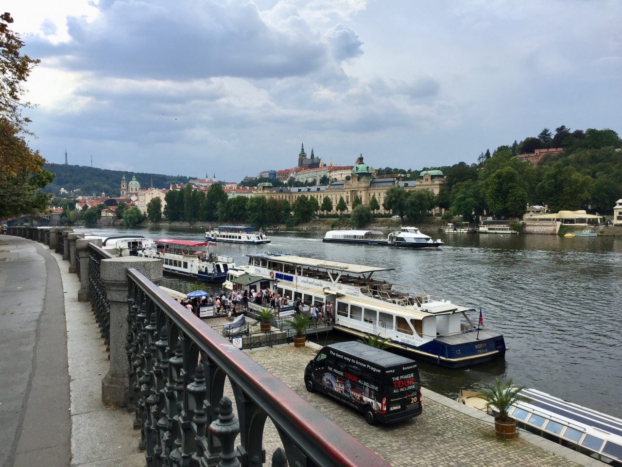 プラハ市内を流れるブルタヴァ川では、遊覧旅行を楽しめます。遊覧船は思ったより大型でした。この川沿いは幅が広く、歩きやすく整備されていたので、別の日に再訪して散歩しました。連日多くの団体観光客がツアーガイドに先導されて遊覧旅行に来ています。