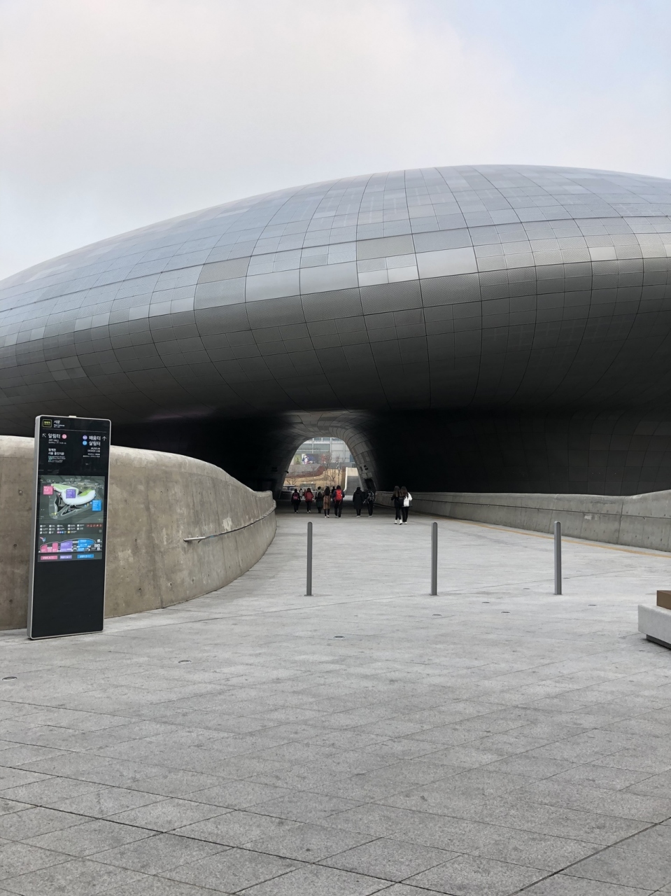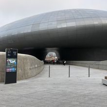 複合施設で、地下鉄東大門歴史文化公園駅出口1番直結です。その出口から地上に出たときに自動扉があるのですが、デザイン性を求めて扉が斜めに倒れているものですが、自動なのに扉の重みで負担がかかっているのか扉が動くことができず、手で扉を動かして地上に出ました。