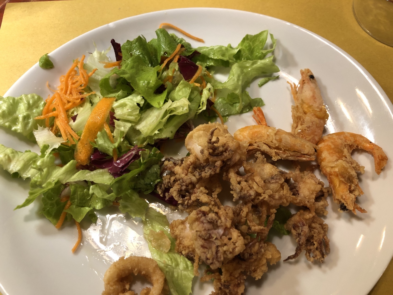 ツアーのディナーで訪問しました。前菜がイカ墨パスタ、量が多く残しました。メインがエビと蛍イカのから揚げとサラダ。美味。デザートはパンナコッタ。紅茶は3ユーロ。(374円)雰囲気は良く、普通に美味しかったです。