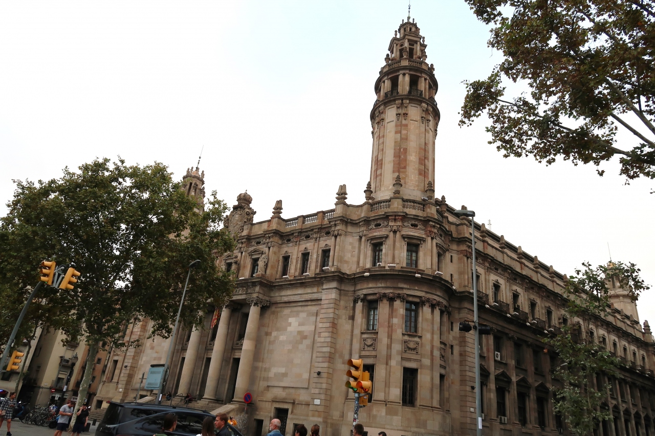 サンタ・マリア・ダル・マル教会見学後、大きな通りVia Laietanaまで出てくると、目の前にワンブロック全体を占めている大きな建物がありました。角に塔が三つ立っていて、正面玄関には円柱が並び、上には王冠付きのスペイン王室の紋章が掲げられている、非常に豪華な外観の中央郵便局でした。すでに営業時間は過ぎていて、中をのぞいてみることはできず、残念です。