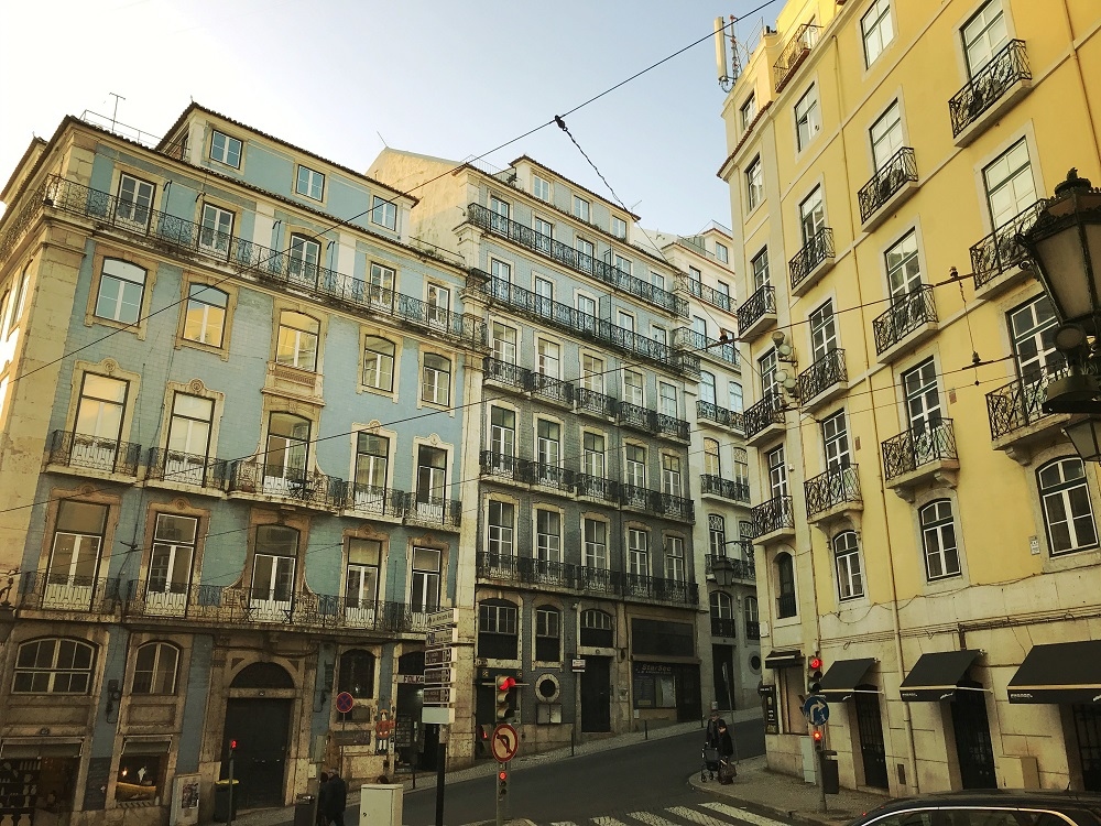 たまたまこの教会の前のマダレナ通りの始まりの風景がとても可愛らしかったので写真に収めました。タイル張りのポルトガルらしい建物が並んでいました。