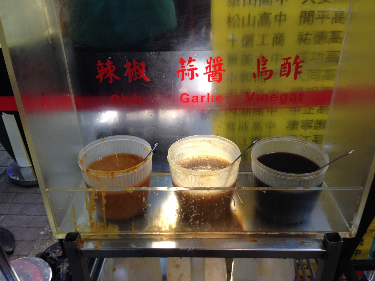 立ち食い形式の店で、カツオ出汁がきいたスープに麺とホルモンが入っていました。そのまま食べるとこんなものかと思いましたが、店の横に置いてある、ニンニク、唐辛子、酢を少しずつ入れるとパンチが効いて劇的に美味しくなりましたよ。