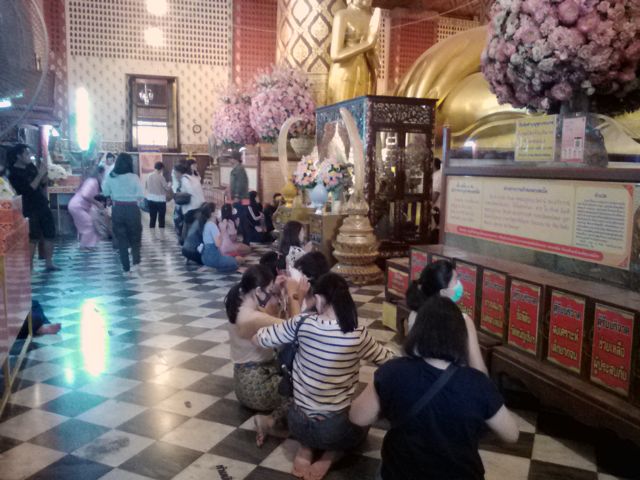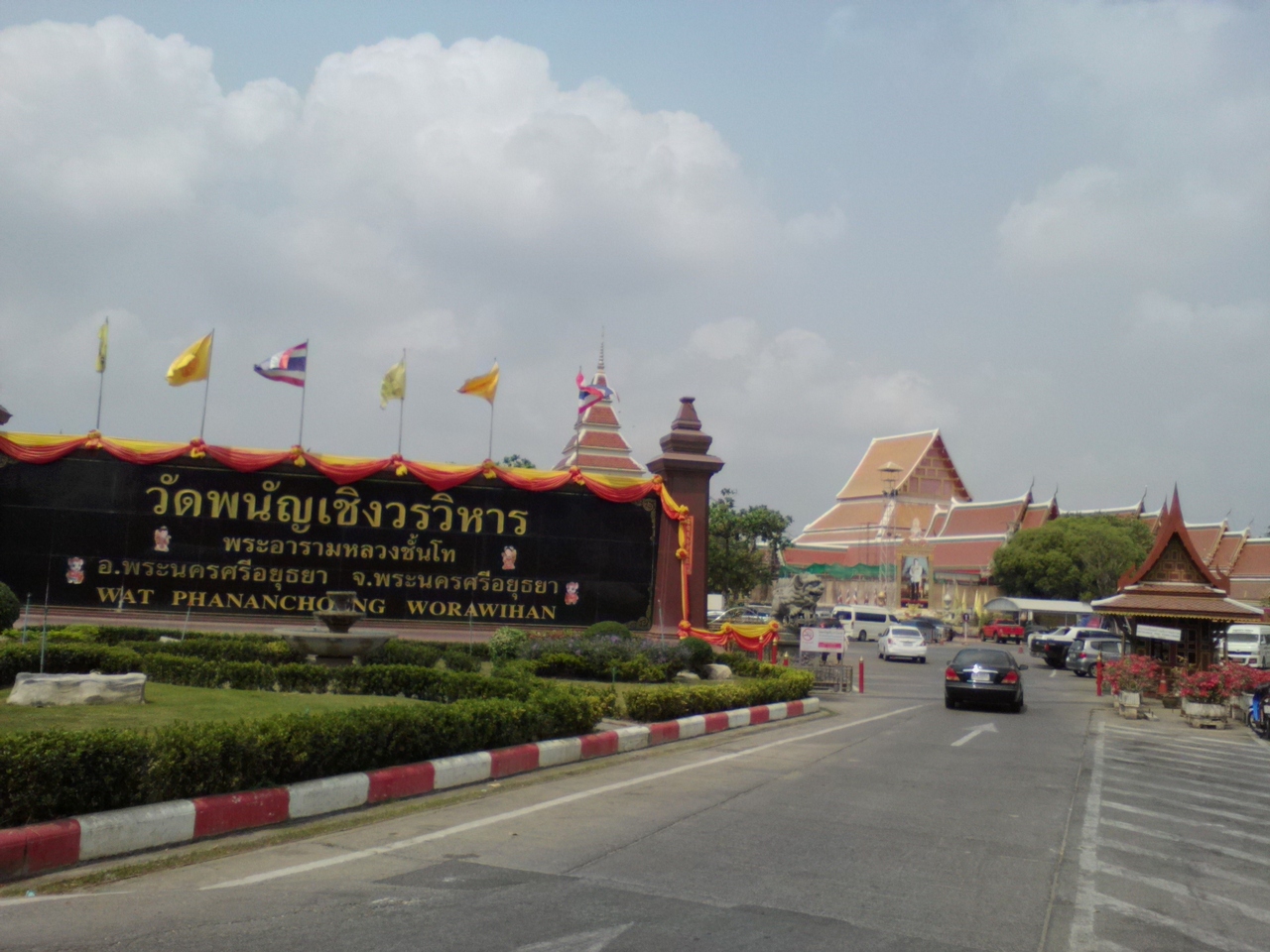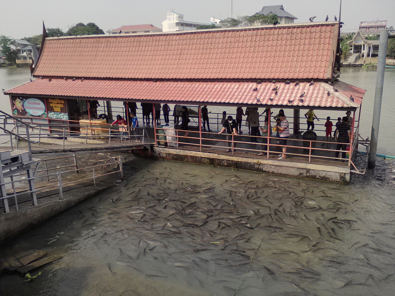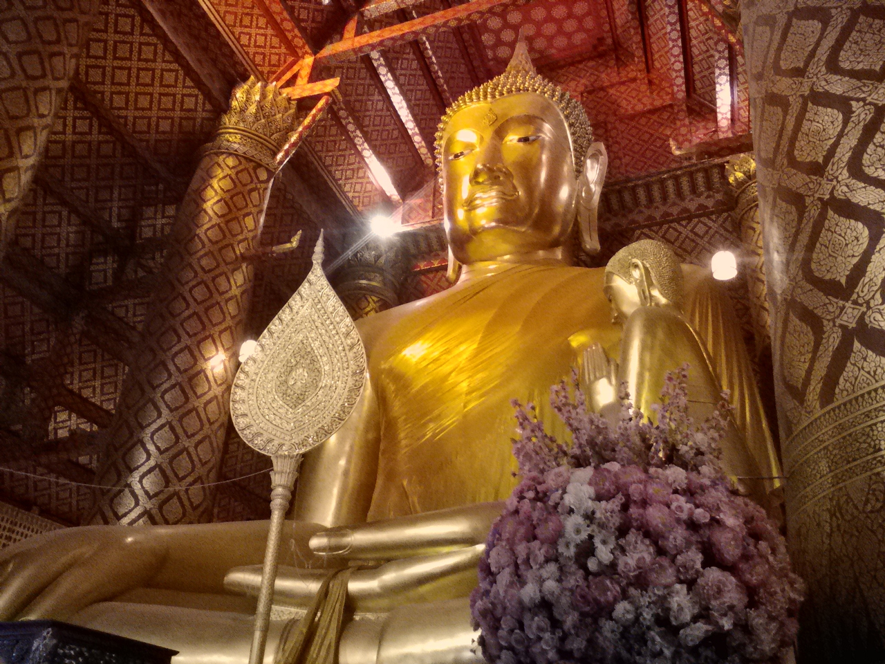 入口の大きさと駐車場の広さから規模の大きなお寺だと言うことはわかりましたが、本堂に入ってびっくり。想像を遥かに超える巨大な仏像が。まさに大仏、黄金に輝く大仏です。アユタヤにある数多くのお寺に行きましたが間違いなくNo.1の大きさです。一見の価値ありです。川沿いでは功徳を積むために魚にエサをあげている方々が大勢います。参拝者はかなり多く信仰を集めているお寺だということもわかります。