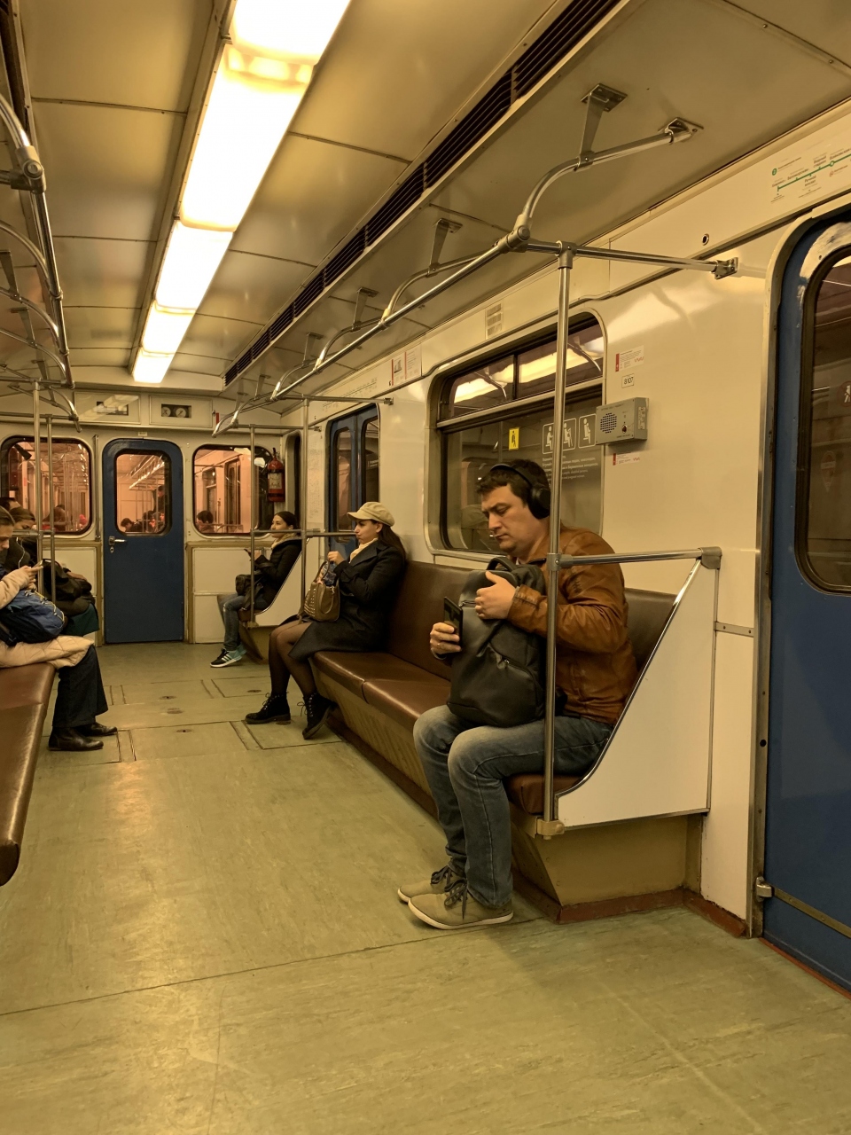 今回の旅行では結構メトロにのりました。今回は到着してすぐの車両です。夕方ですが、空いています。社内は少し暗いです。車両の幅は大きいです。走ると音がうるさいです。モスクワも多民族なので地下鉄乗っているといろんな人がいて面白い