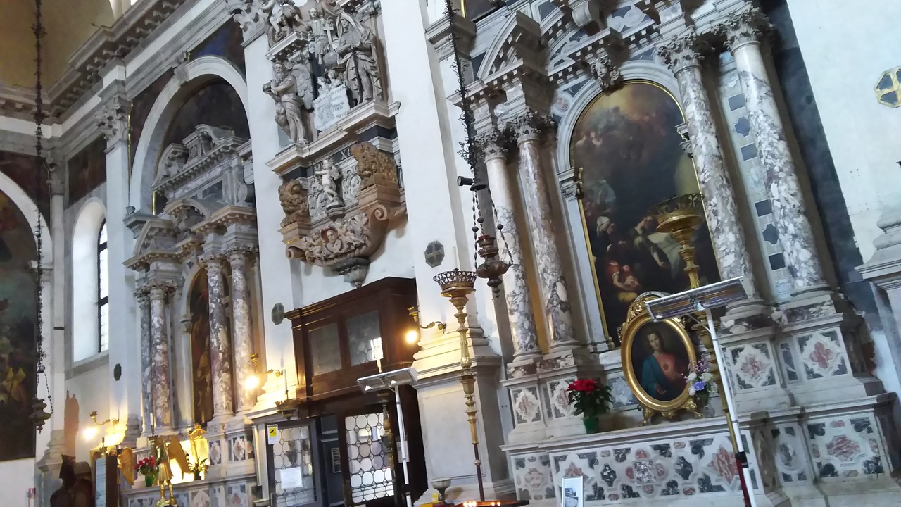 祭壇や壁の絵画の周囲もカラフルな大理石などの石で作られていて、美しい色使いでした。マーブル模様の柱が美しいなと思いました。飾り彫刻もとても細かくて、豪華でした。