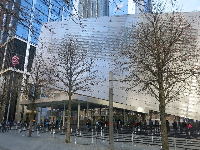 記念博物館です。ガラス張りの外観が目を引く建物で入口は北側。ビルに押しつぶされたNY市消防局のはしご車や
