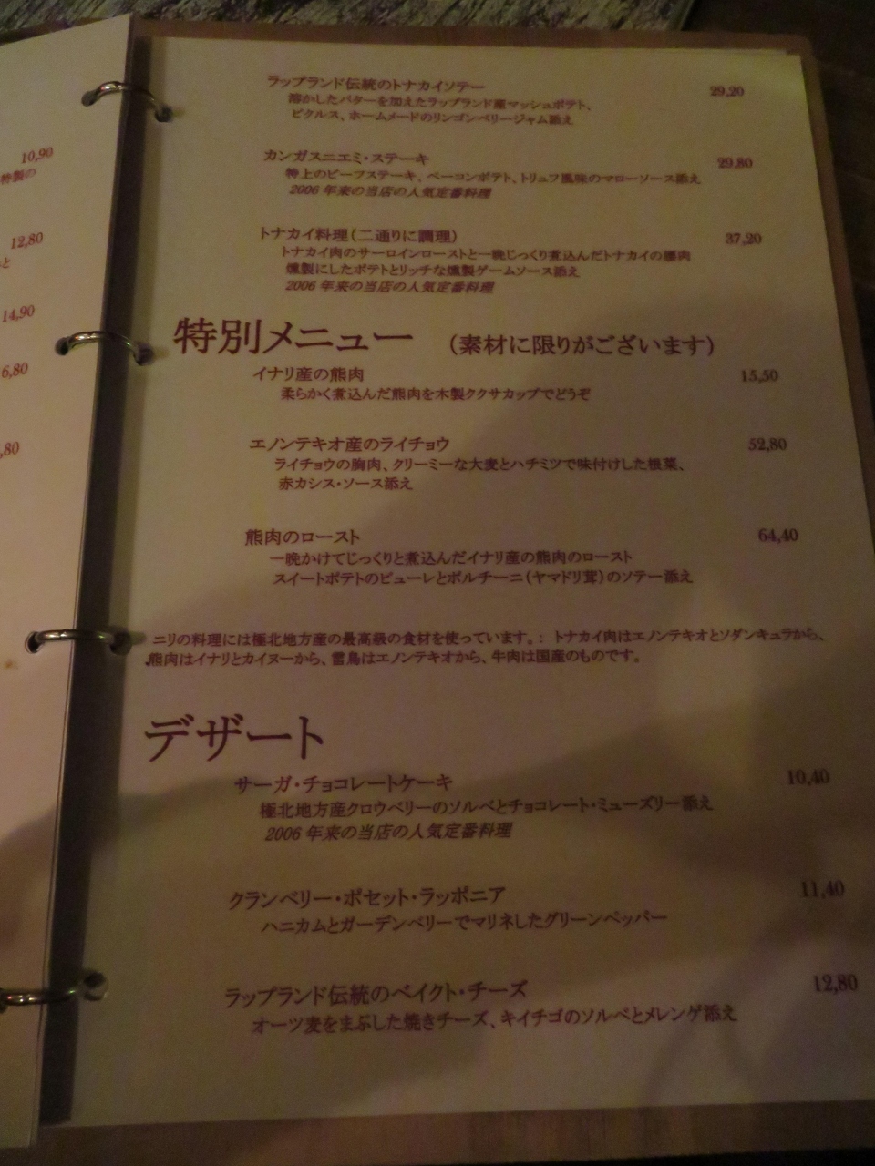 市内からアクセスもしやすく、ラップランドの料理を楽しめます。私はツアーではありませんでしたが、日本人のツアー客が目立ちました。きちんと予約しないと利用できません。日本語のメニューもあり、便利ですが、店員との意思疎通は英語です。メイン1つで1名がお腹一杯になると思います。水道水は1人1ユーロでした。