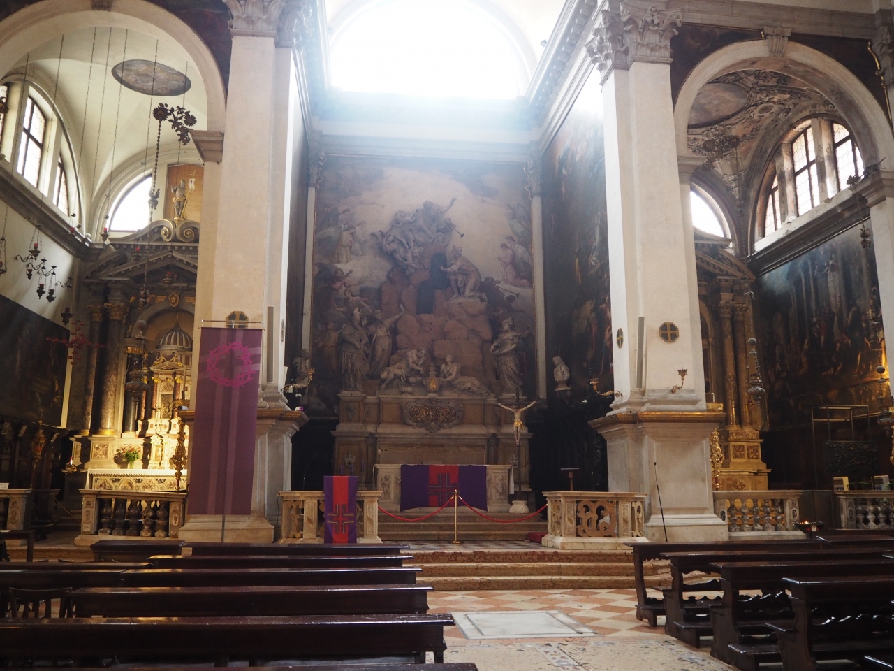 サンマルコ広場から西へと歩いていくと、ブランドショップが多く並ぶ通りの一角に、サン・モイゼ教会はあります。こじんまりとした教会ですが、バロック様式の豪華な感じがある建物で、正面祭壇の彫刻や壁面の絵画など見どころが多い教会です。アクセスはとてもいので寄る価値はあります。