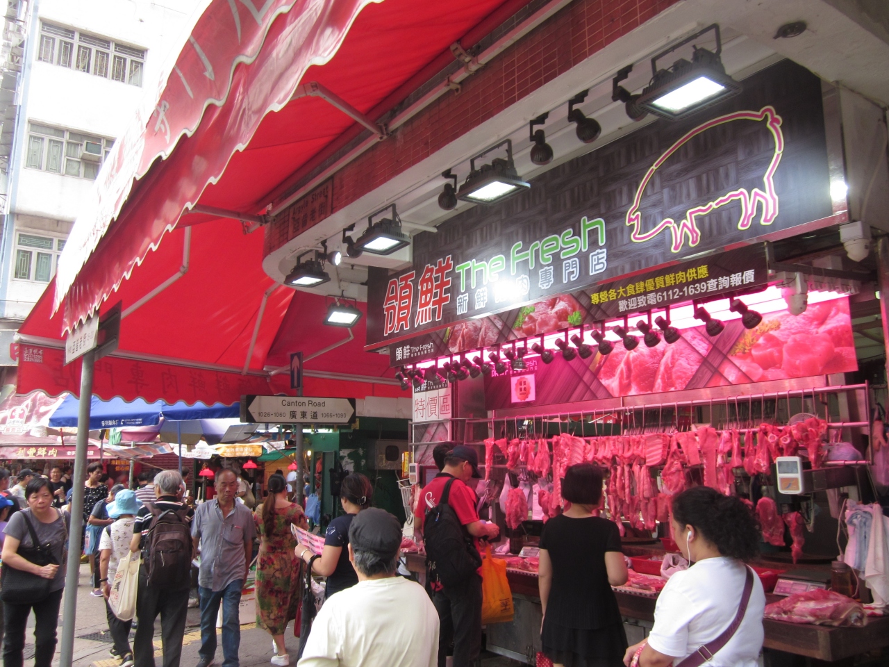 上海街も、かなりディープな感じでしたが、この廣東道は、さらにディープでした。市場のようになっていて、主に生活食品がメインのようです。野菜、果実、精肉など、香港の生活感あるエリアでした。