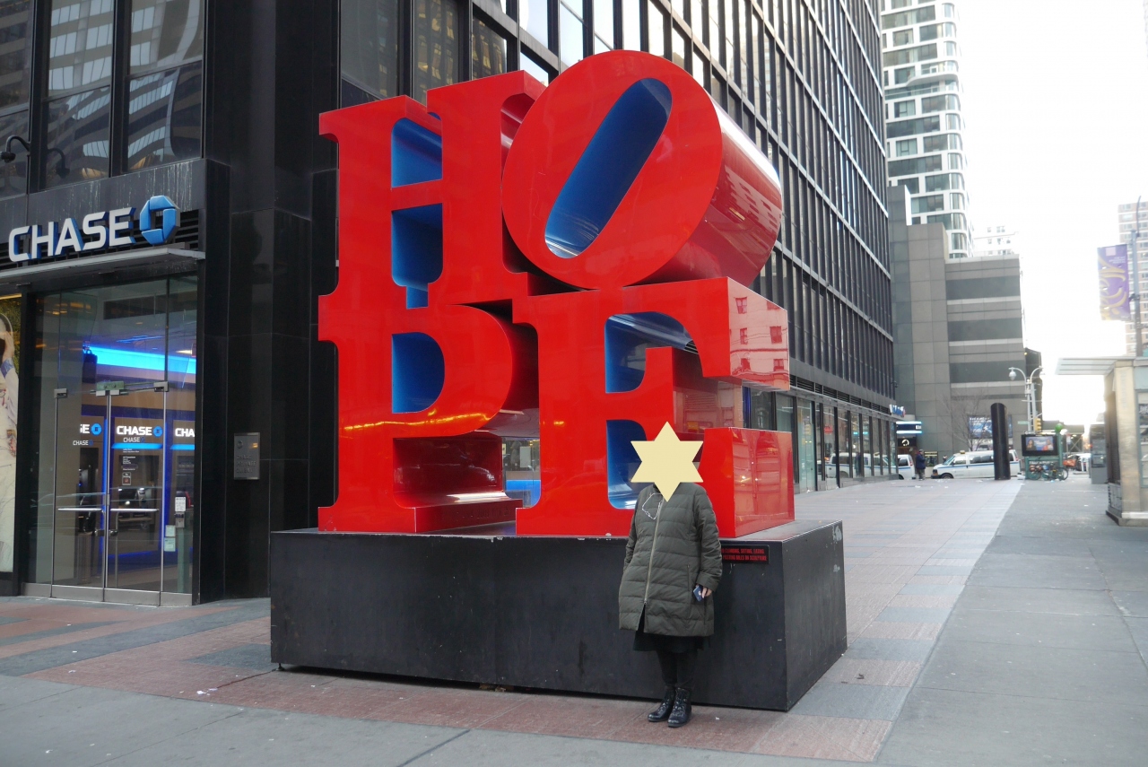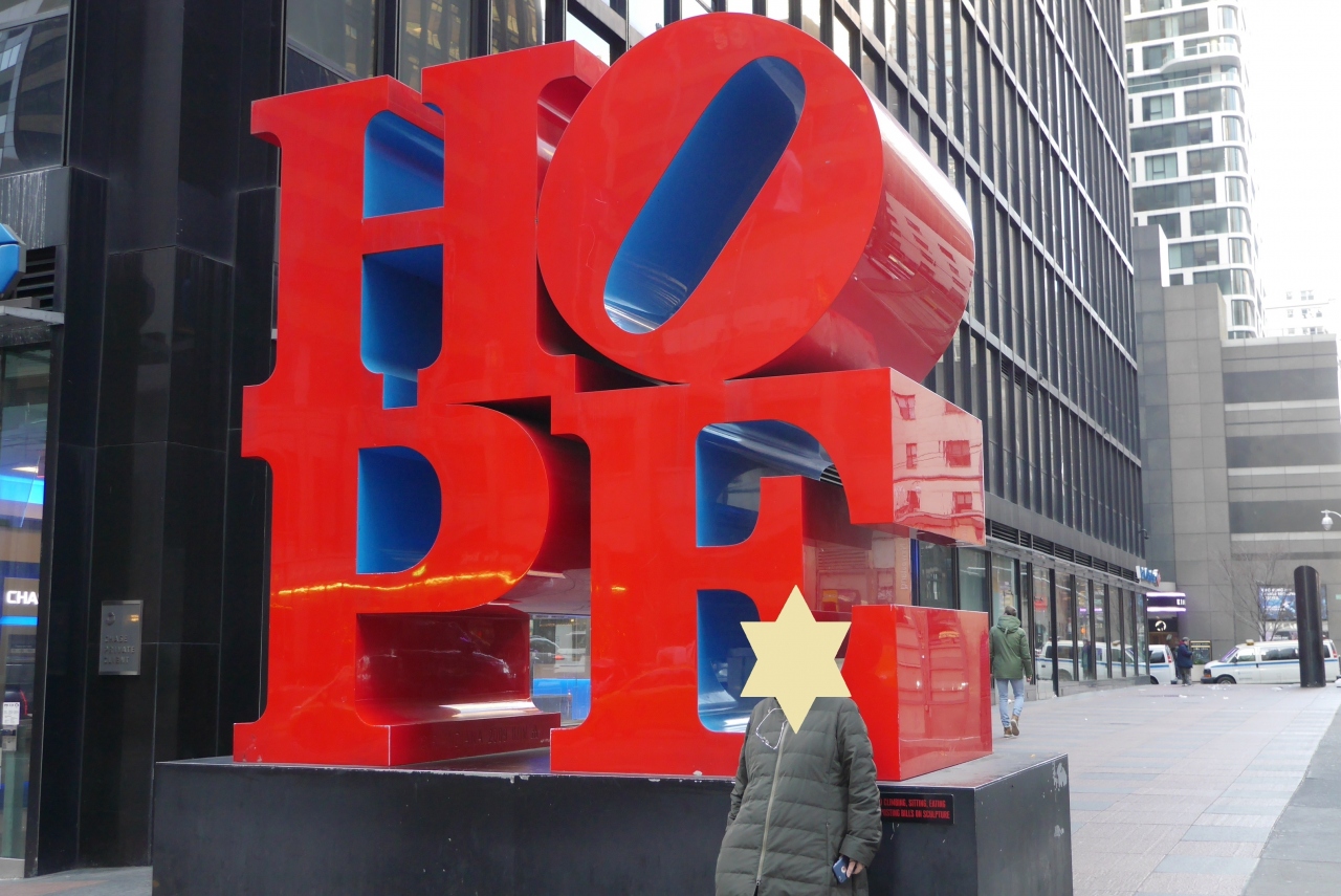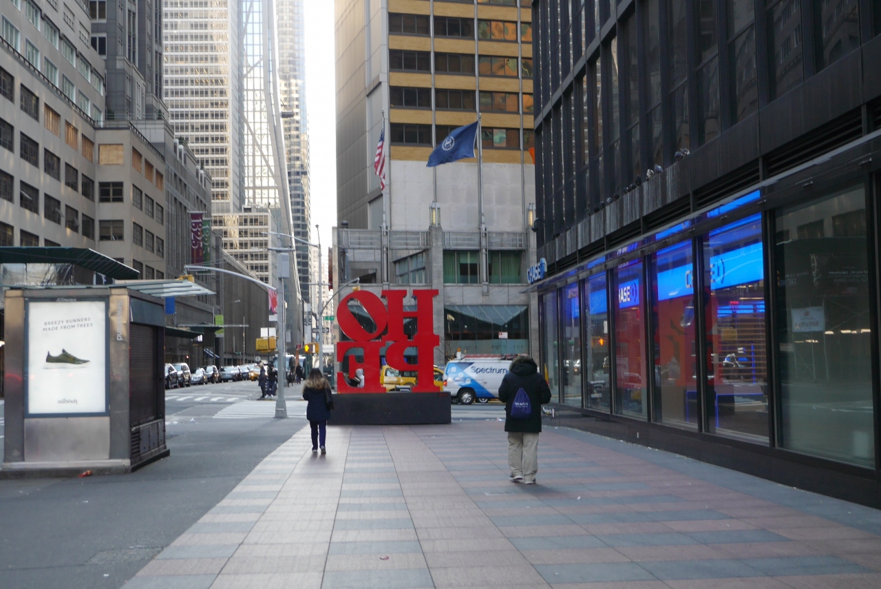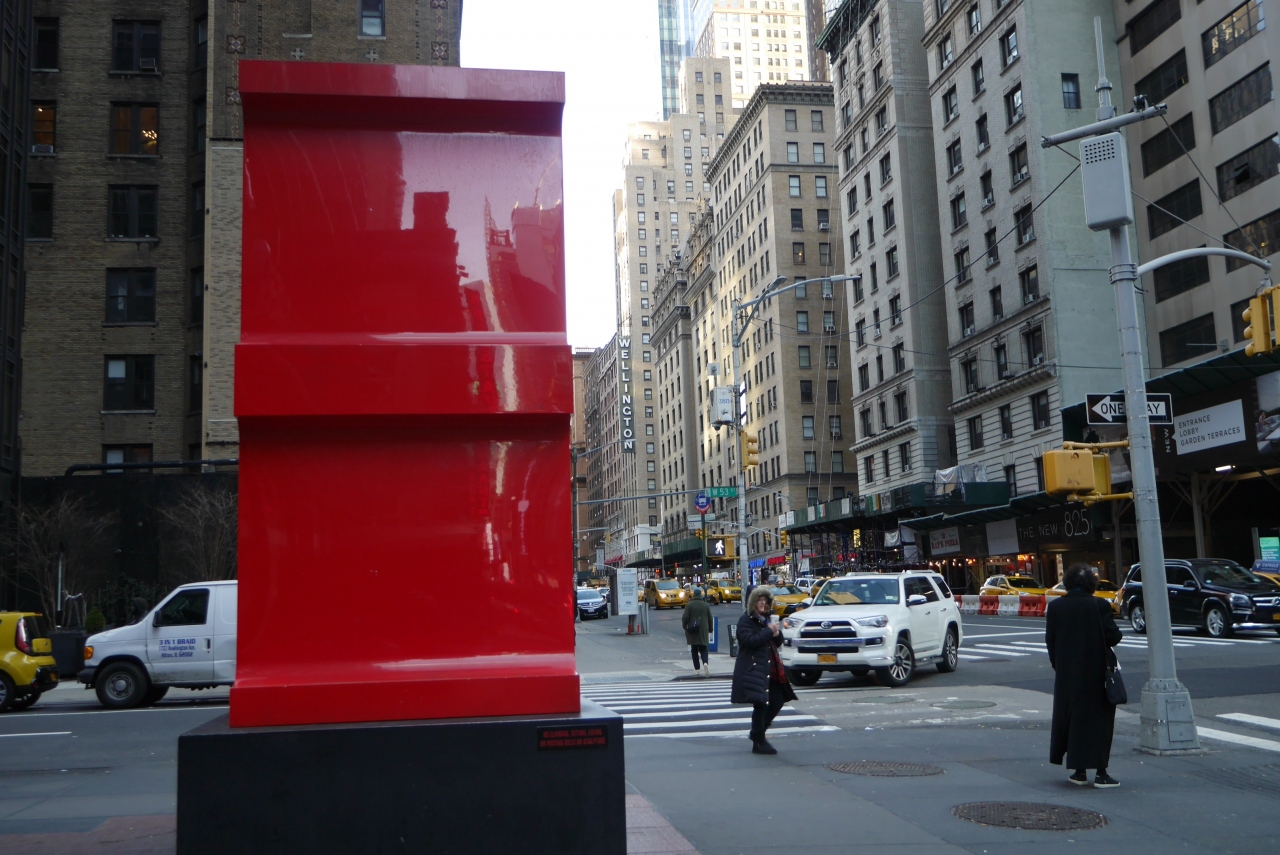 ニューヨークを歩いていると街中アートを目にします。何種類かある赤い色が目立つ作品で歩道脇の割と広い部分に置かれたものです。