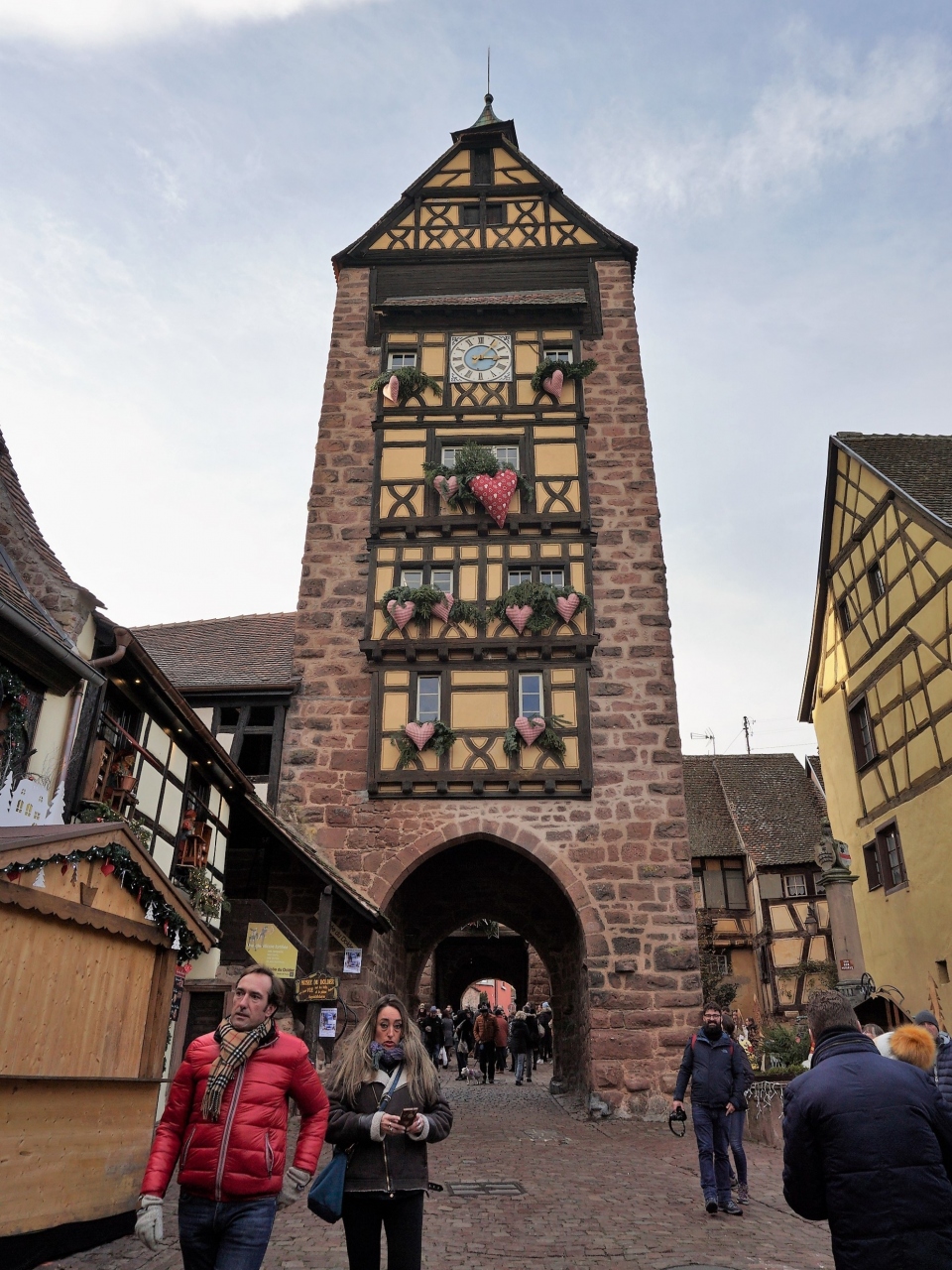 少し上り坂のメインストリートの両側に木組みの家が並び、そぞろ歩きが楽しい!メインストリートの終わりに塔があり、塔をくぐると、かつては城壁が村を囲んでいたことがわかります。
