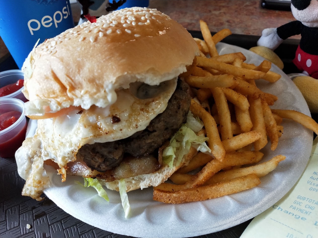 お店のオススメのランチェルバーガー(Rancheru Burger:$10)は、約227gにも及ぶジューシーなお肉に、カリカリベーコンと目玉焼きを挟んだとてもボリューム満点の1品。