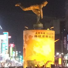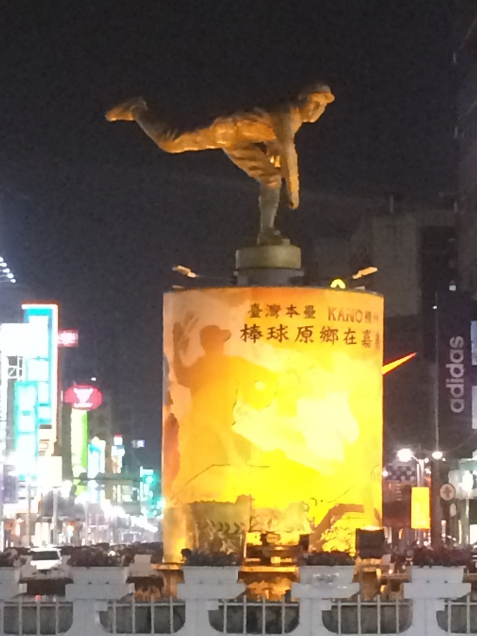 嘉義駅からも行ける夜市付近にあるロータリーに大きな野球選手の像が建っています。映画「KANO」を記念して、立てられたもので、夜になるとオレンジの色にライトアップされていました。実は野球選手の像が回ってました。