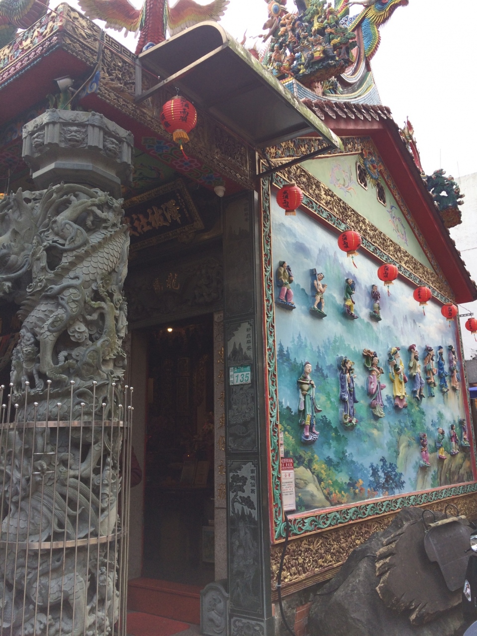 今回久しぶりに行ったら電光掲示板が増えたのか大きくなったような気がしました。ゴミ箱がちょうどこの集順廟の前にあり、そこで臭豆腐の串や紙箱などを捨てます。お寺の彫刻は、かなり精密で見ごたえのあるものでした。