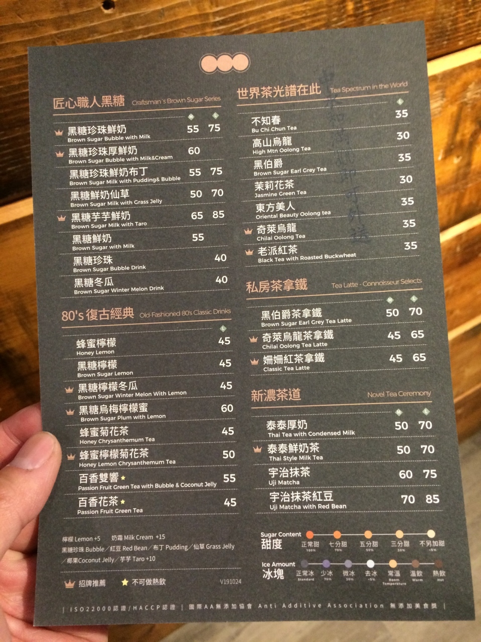 黒糖タピオカミルクティーとタロイモが入った芋芋ミルクティーみたいなのを気に入っています。マイボトルを持参すると少し値段が安くなり、エコです。先日は、台湾人で身分証に特定の数字が入っている人は半額?みたいなセールをしていました。