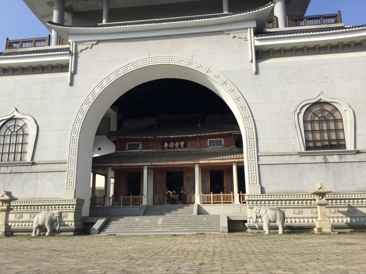 本堂の前には白い象とその隣には日本様式の灯篭があります。