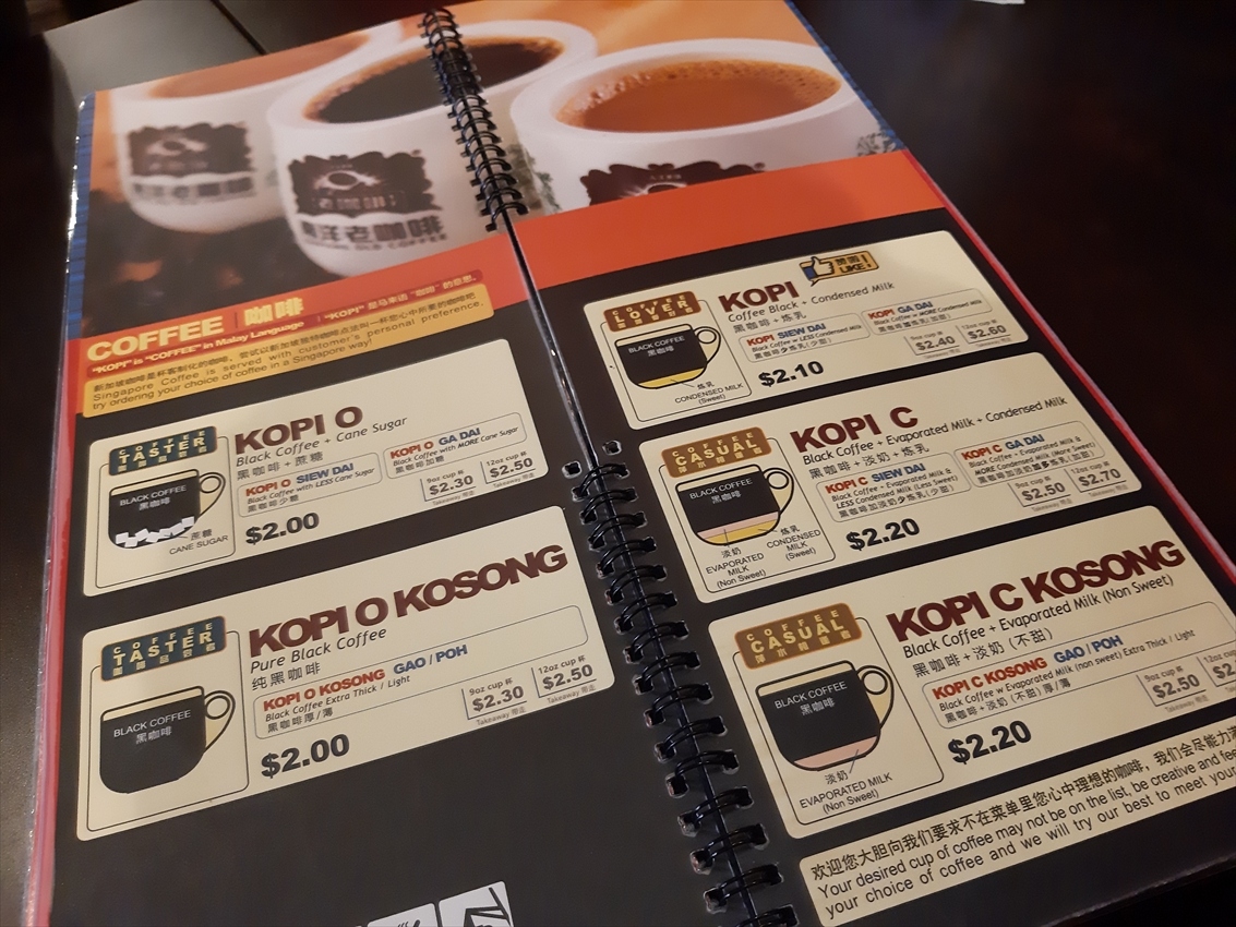 砂糖抜きのブラックは珈琲烏(KOPI O)で、どちらも同じ2シンガポール・ドル。