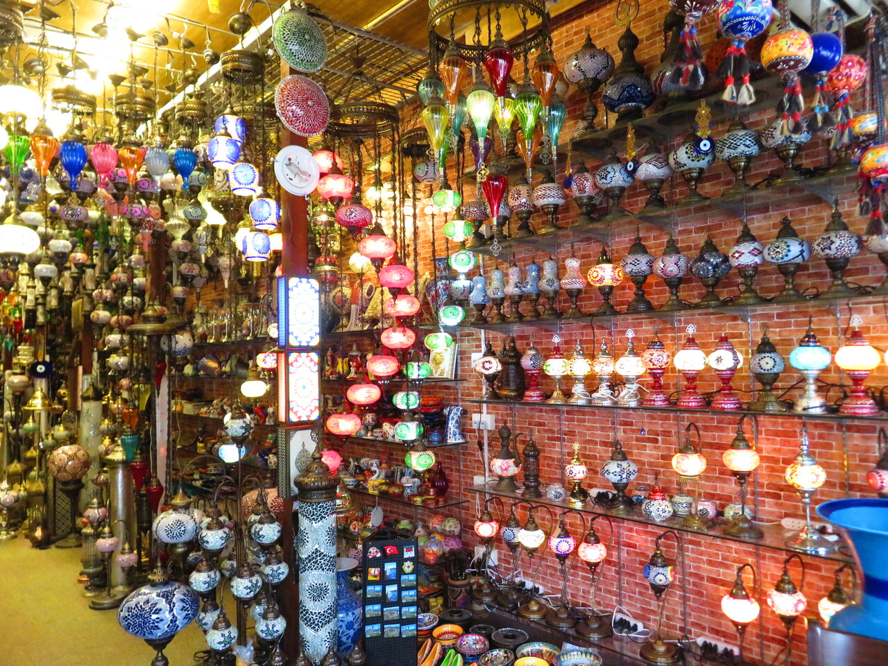 エキゾチックなスカーフ、クッションカバー、香水瓶やトルコランプなどおしゃれな土産物屋が並んでいます。