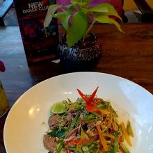 食事は以前カンボジアに来た時においしかった、フレッシュビーフサラダ。