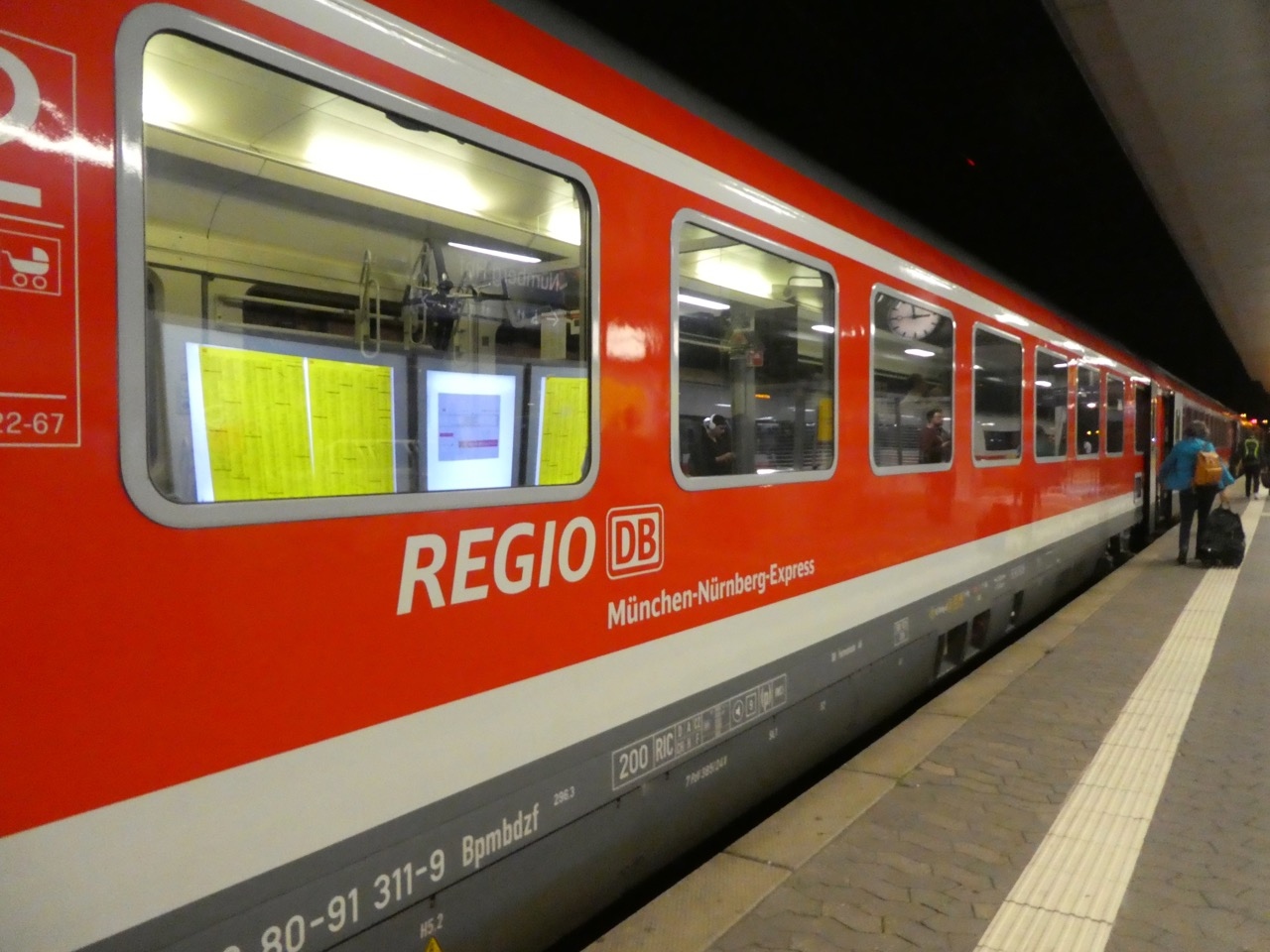 インゴルシュタットとの間を往復。片道はRE(快速)、片道はICEでした。速度差はああたりまえですが、REも昔の特急型客車を使っていてロマンスシートでリクライニングもして快適でした。狙ってみるのもいいでしょう。ただ1等席はほんのわずかしかなく、1等のパスを持っている方には不向きです。