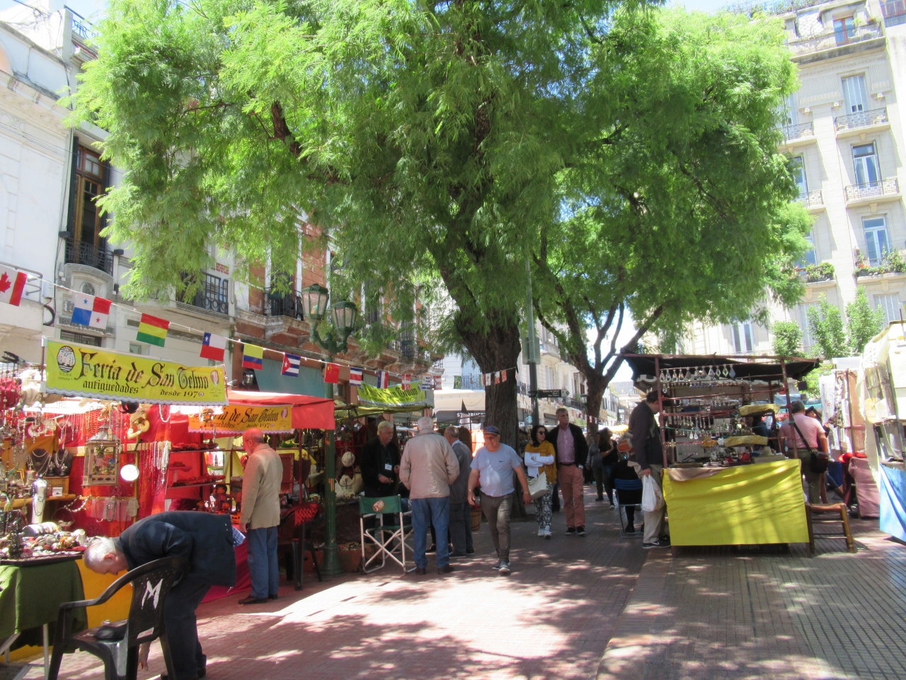五月広場からディフェンサ通りを南へ15分ほど歩いていきました。日曜日だったので骨董市のテントが並び、人出も多くにぎやかでした。広場でタンゴも踊っていました。
