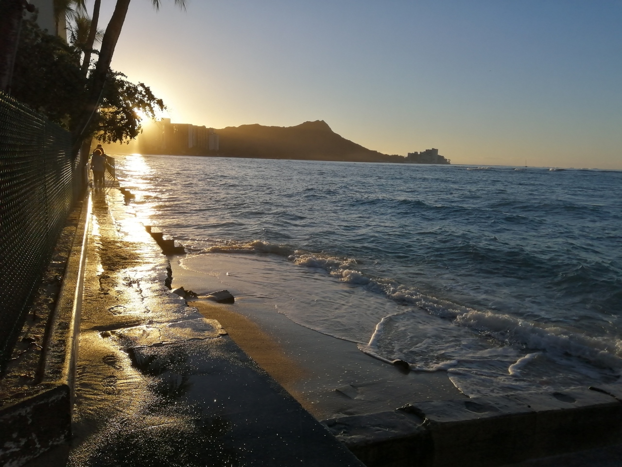 1月の朝の時間帯は満ち潮で波も高く、遊歩道にまで波が打ち寄せる時もありましたが、朝の内に行くと人も少なく良かったです。