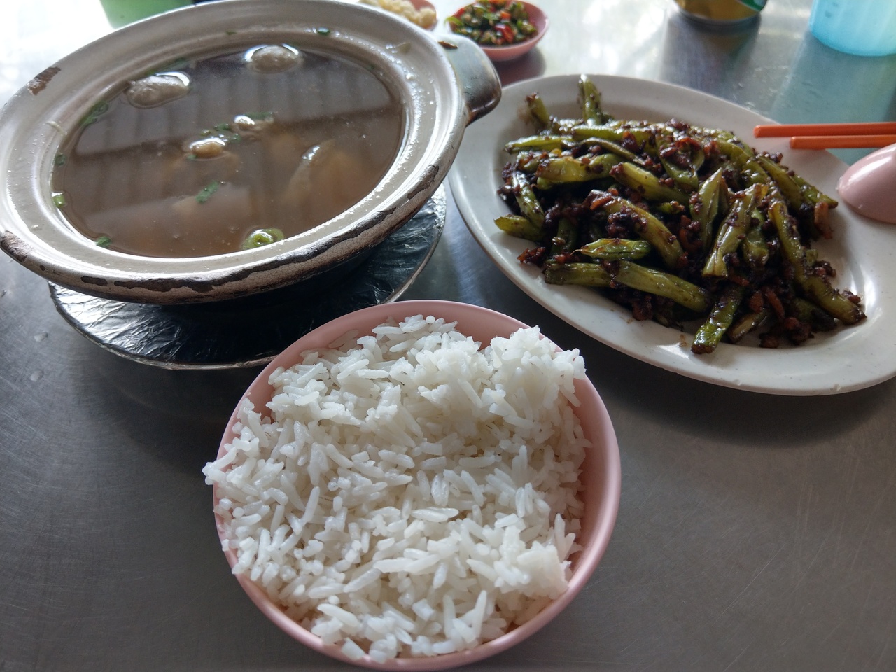 バクテーは一種類のみ+青菜系の炒め物でオススメされたインゲンみたいな炒め物+ご飯+100PLUS=約RM27。