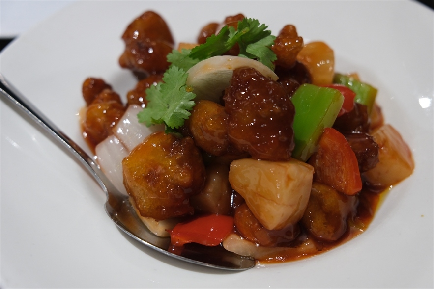 ワンタン・スープのほか、酢豚や野菜料理、それに炒飯を一つ取ってシェアしてみました。