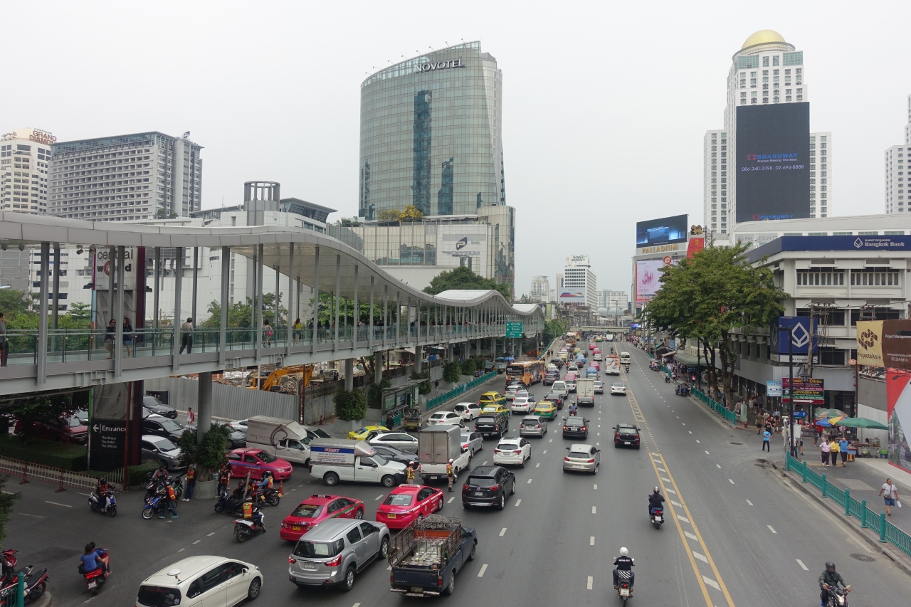 ラチャプラソン交差点から北のプラティナムまではスカイウォークが整備されており、通りを跨ぐ歩道橋の上からはバンコク名物の渋滞風景が撮れます。今回は昼間だからか思ったほどの渋滞ではなかったけど、それでも相変わらず交通量は多めでした。
