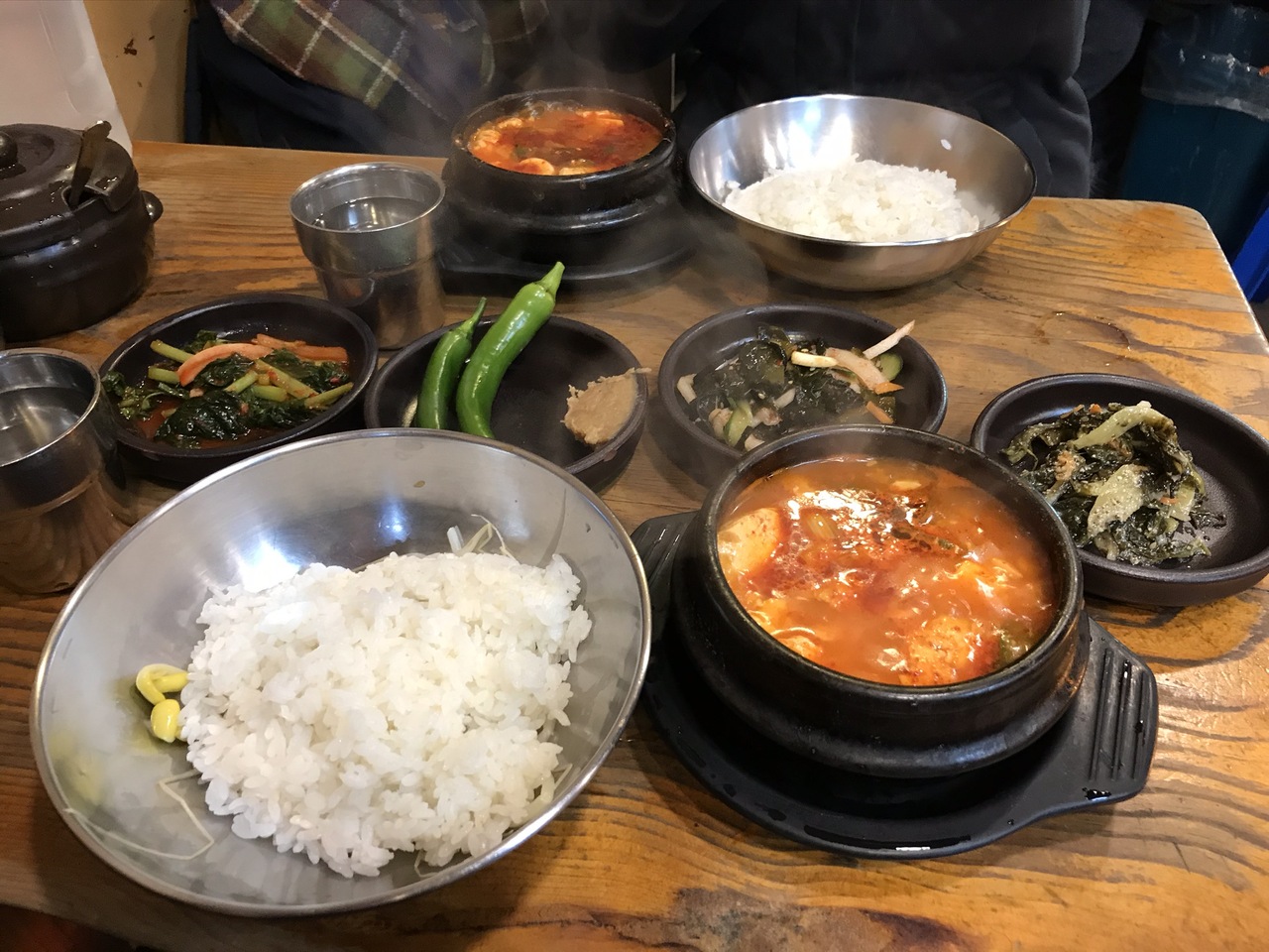グツグツと音を立てて運ばれてきました。食べる前から熱々が伝わってきます。一口食べて、熱っ!美味しい!辛いものが好きな私にはちょうど良い辛さでした。ご飯の下には豆もやしが入っていて、スンドゥブと混ぜて食べると益々美味しいです。付け合わせのおかずも美味しかったです。