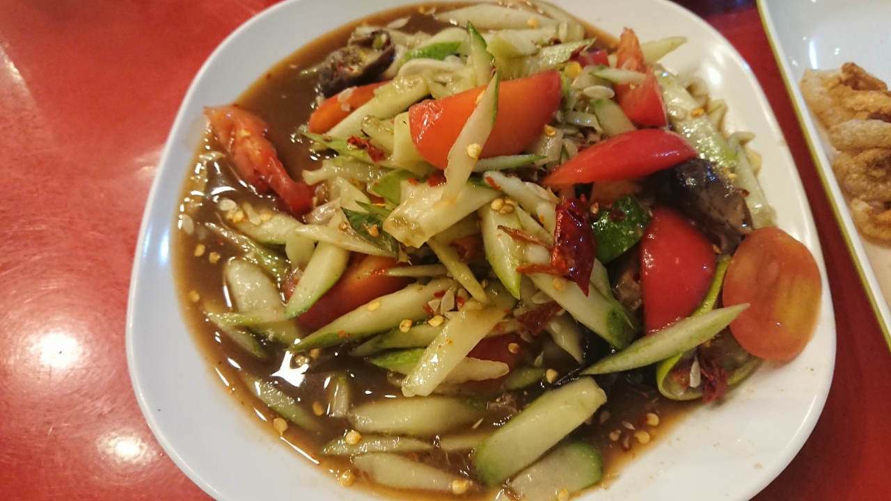 カノムジーンにキュウリのソムタム、コーンのソムタムの様なものを食べたが、どれも美味しく辛い。