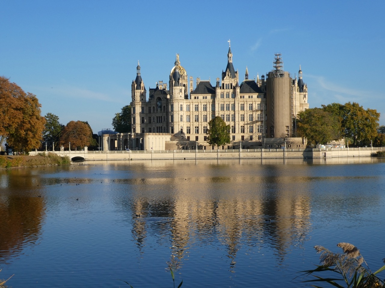 シュベリーン中央駅から徒歩20分くらい。街を通り抜けた先に湖に浮かぶ優美なお城が。ドイツらしくない優美さです。フランスの城を参考にして建てられたそうです。普通に城を目指して訪問すると城をつなぐ橋に出てしまいますので、湖に浮かぶ姿を見るには街のメインストリートのメクレンブルク通りをまっすぐ行ってREWEというスーパーの手前あたりで左に曲がると湖岸に出ますので、そのあたりから眺めるのがきれいです。カップルがいっぱい護岸に腰掛けておしゃべりしてました。陽のあたる夕刻がきれいでした。