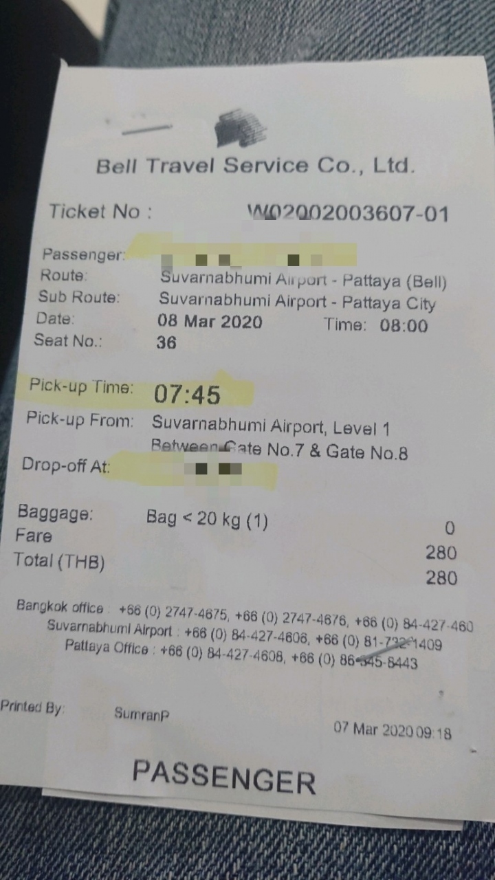 スワンナプーム空港の1階の7番8番ゲートの間に時間前になると現れるスタッフを見つけることから。空港バスのカウンターとは違いスタッフがベンチにいるだけなのでわかりづらい。ベルトラベルの服を着ている。名前を言ってチケットをもらう。時間になったら一緒に移動。席は指定席でチケットに表記で事前にネットでも指定できる。
