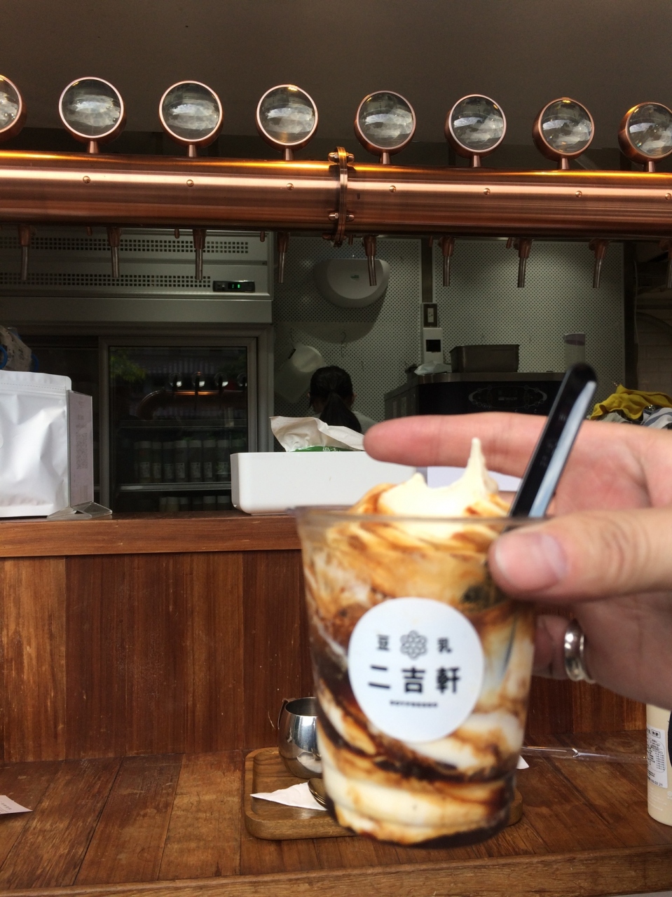色々な種類の豆乳がありました。タロイモ豆乳、いちご豆乳、抹茶豆乳、あずき豆乳などです。大きいボトルと小さいボトルがあり、値段も違います。お天気だったので、豆乳アイスも買いました。席は、屋外で5席くらいありました